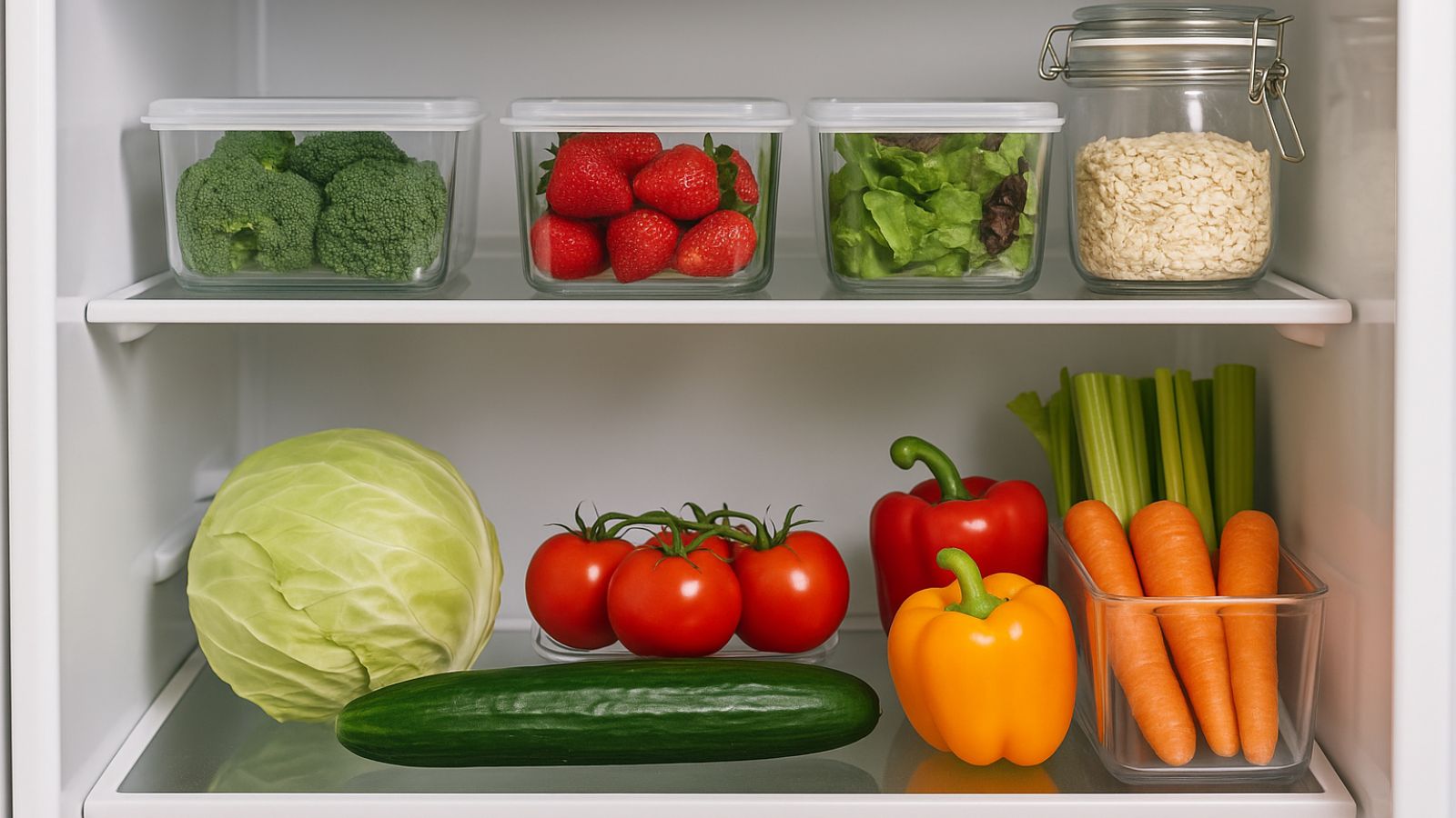 Organizovaná chladnička s čerstvou zeleninou a ovocím v priehľadných dózach a sklenenej nádobe.