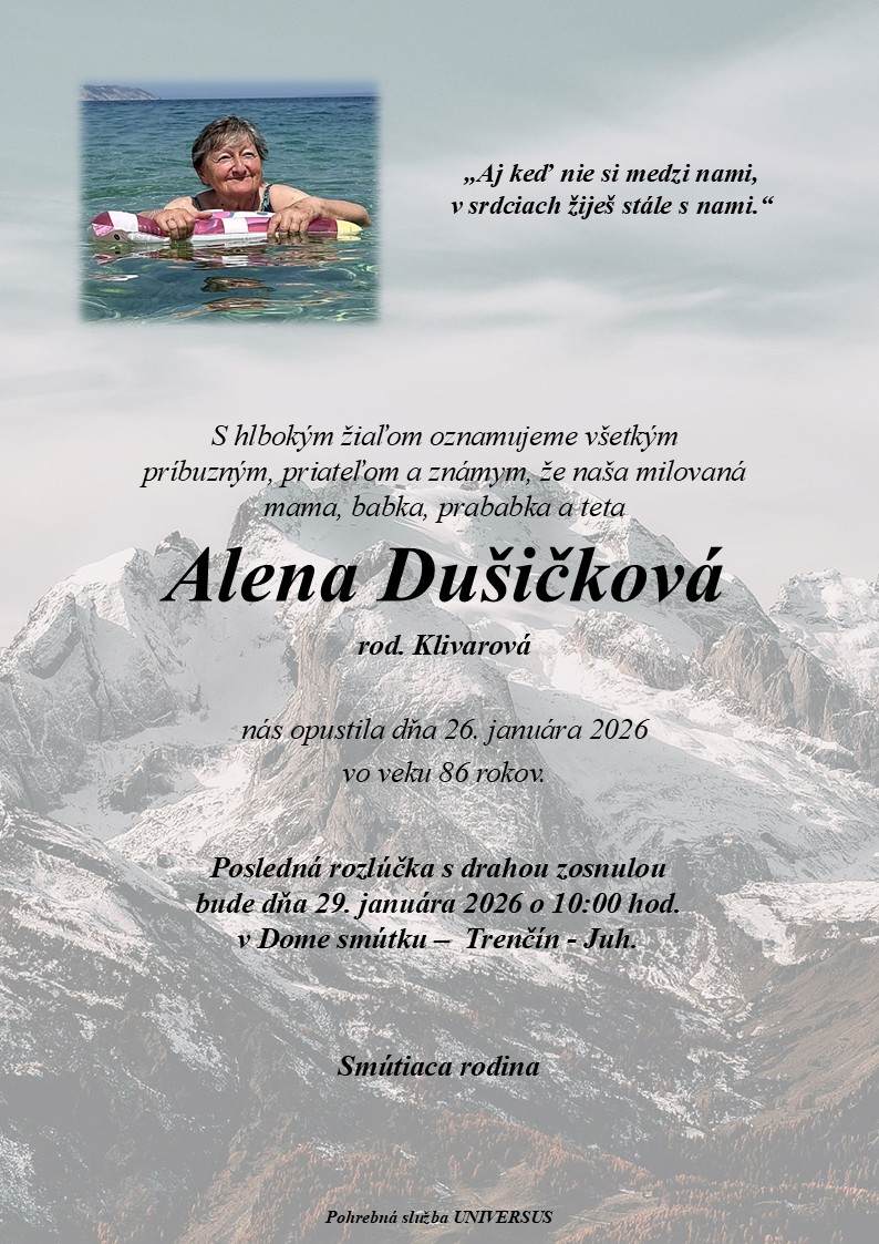 S hlbokým žiaľom oznamujeme všetkým príbuzným, priateľom a známym, že Alena Dušičková nás opustil(a) dňa: 26.01.2026, vo veku 86 rokov. Posledná rozlúčka sa uskutoční dňa: 29.01.2026.