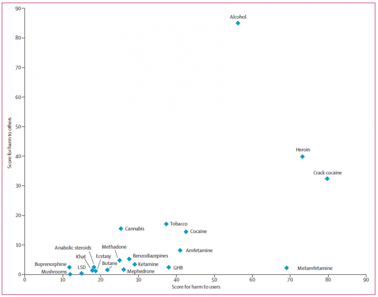 Nasledujúca tabuľka zobrazuje celkové hodnotenie nebezpečnosti drog a príspevok každého faktora vrátane úmrtnosti, poškodenia zdravia, miery závislosti, duševného poškodenia, ekonomických škôd (alkohol a tabak dosiahli v tomto ukazovateli najvyššie hodnotenie), vplyvu na kriminalitu, ujmy na rodine atď. Zdroj: The Lancet.