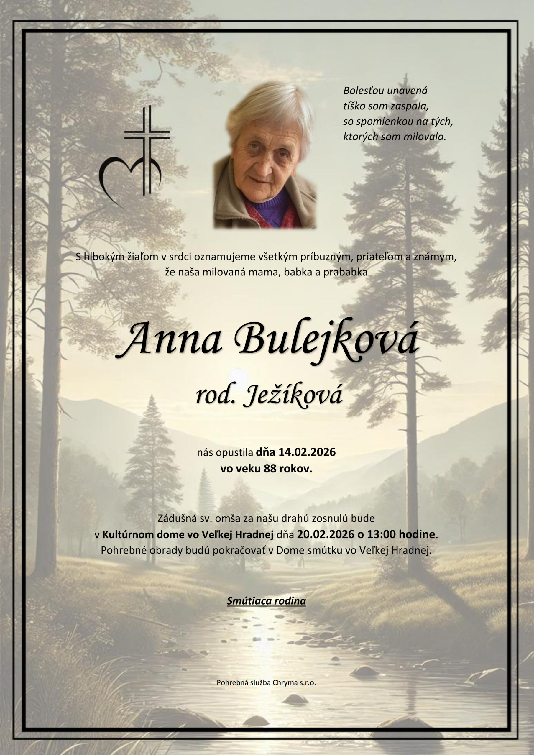 S hlbokým žiaľom oznamujeme všetkým príbuzným, priateľom a známym, že Anna Bulejková rod. Ježíková nás opustil(a) dňa: 14.02.2026, vo veku 88 rokov. Posledná rozlúčka sa uskutoční dňa: 20.02.2026.