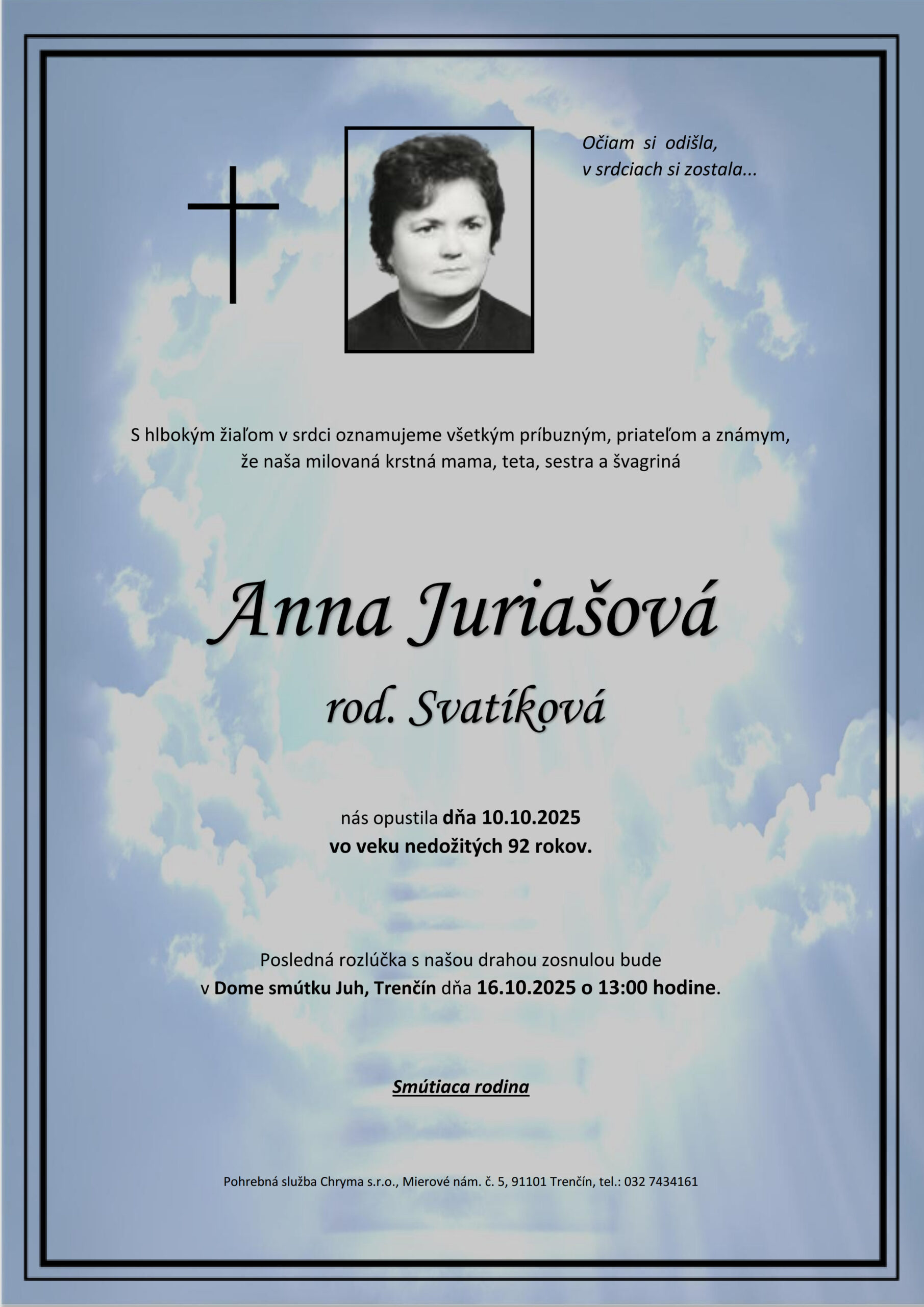 S hlbokým žiaľom oznamujeme všetkým príbuzným, priateľom a známym, že Anna Juriašová rod. Svatíková nás opustil(a) dňa: 10.10.2025, vo veku 91 rokov. Posledná rozlúčka sa uskutoční dňa: 16.10.2025.