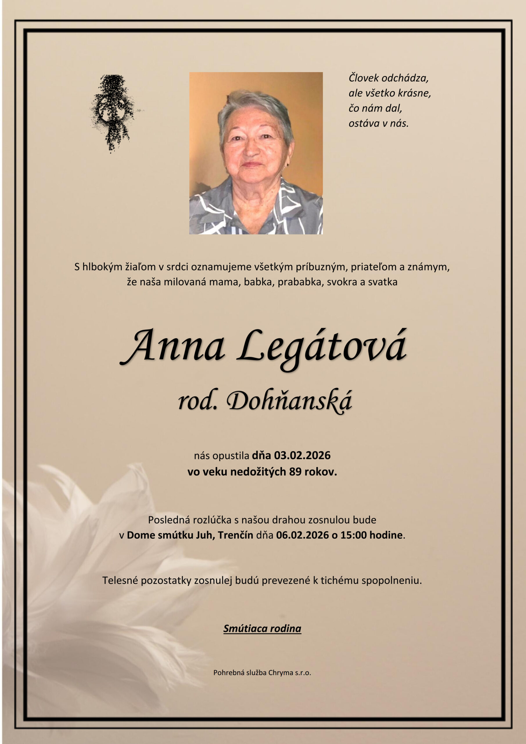 S hlbokým žiaľom oznamujeme všetkým príbuzným, priateľom a známym, že Anna Legátová rod. Dohňanská nás opustil(a) dňa: 03.02.2026, vo veku 88 rokov. Posledná rozlúčka sa uskutoční dňa: 06.02.2026.
