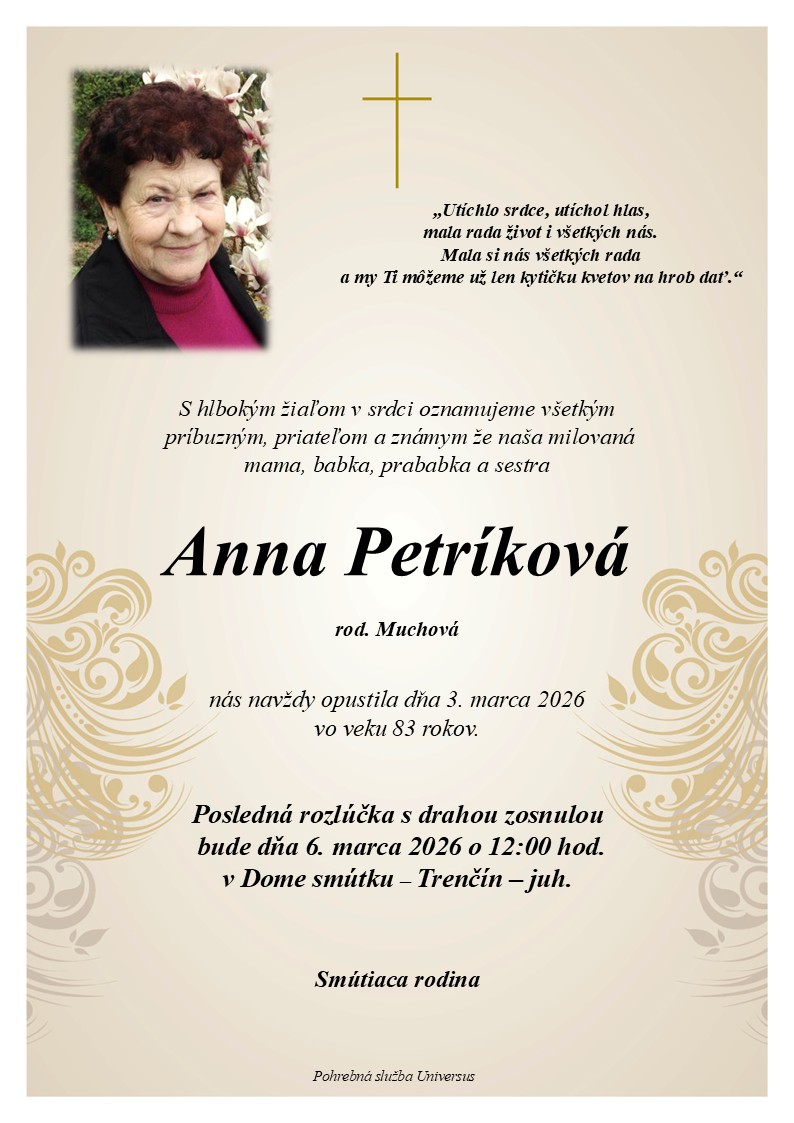 S hlbokým žiaľom oznamujeme všetkým príbuzným, priateľom a známym, že Anna Petríková nás opustil(a) dňa: 03.03.2026, vo veku 83 rokov. Posledná rozlúčka sa uskutoční dňa: 06.03.2026.
