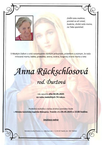 ⏱️ Čas čítania: 1 min (41 slov) S hlbokým žiaľom oznamujeme všetkým príbuzným, priateľom a známym, že Anna Rückschlosová rod. Ďuržová nás opustil(a) dňa: 02.05.2025, vo veku 73 rokov. Posledná rozlúčka sa uskutoční dňa: 05.05.2025.