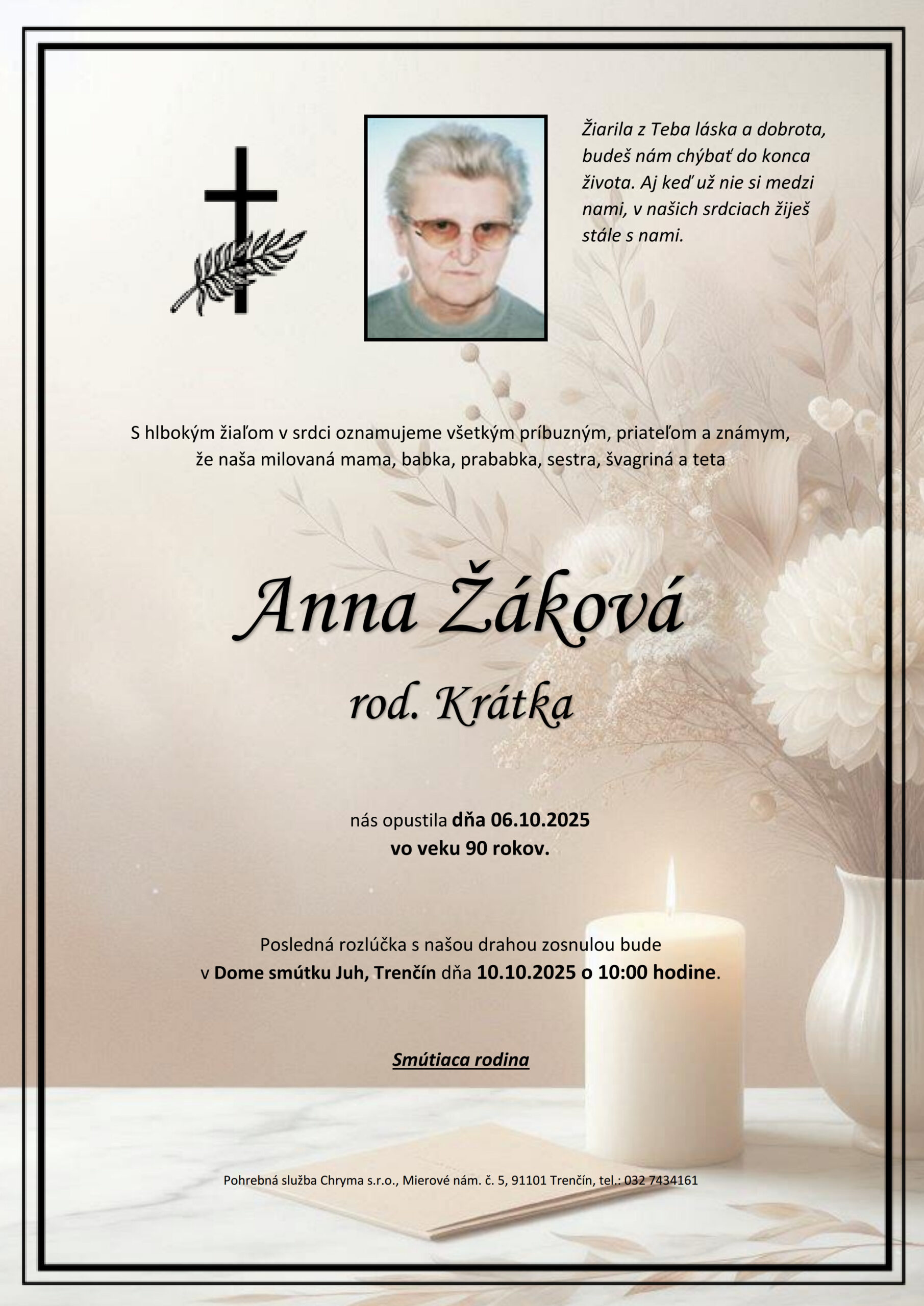 S hlbokým žiaľom oznamujeme všetkým príbuzným, priateľom a známym, že Anna Žáková rod. Krátka nás opustil(a) dňa: 06.10.2025, vo veku 90 rokov. Posledná rozlúčka sa uskutoční dňa: 10.10.2025.