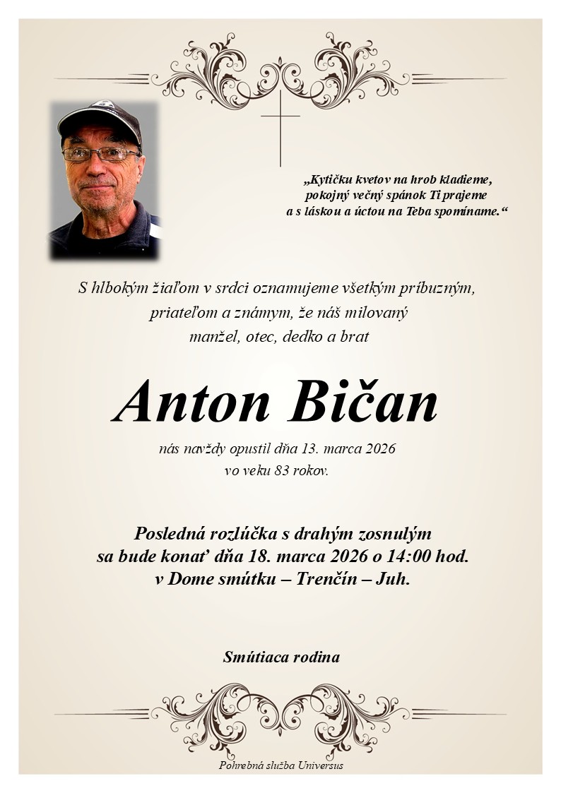S hlbokým žiaľom oznamujeme všetkým príbuzným, priateľom a známym, že Anton Bičan nás opustil(a) dňa: 13.03.2026, vo veku 83 rokov. Posledná rozlúčka sa uskutoční dňa: 18.03.2026.