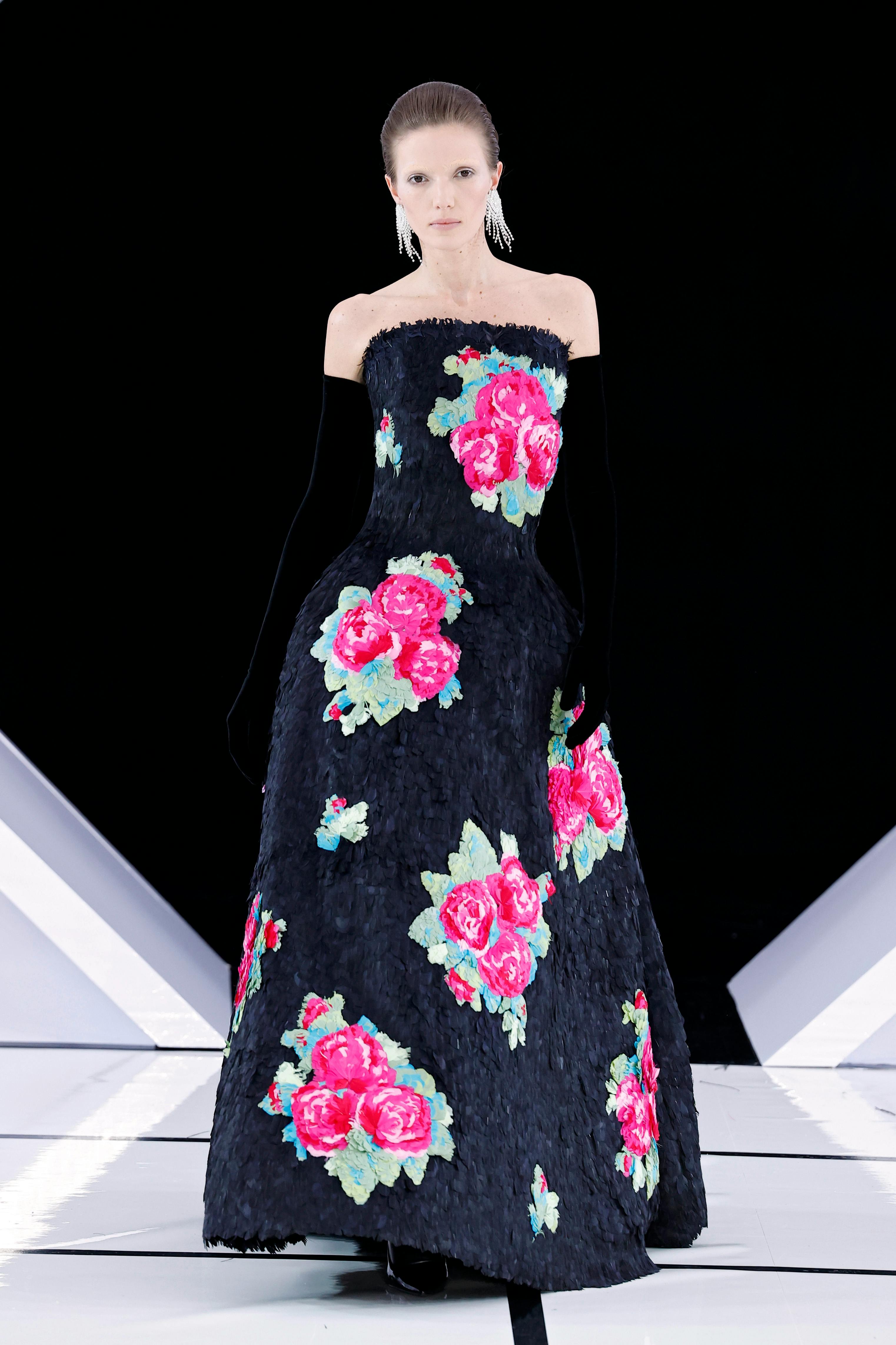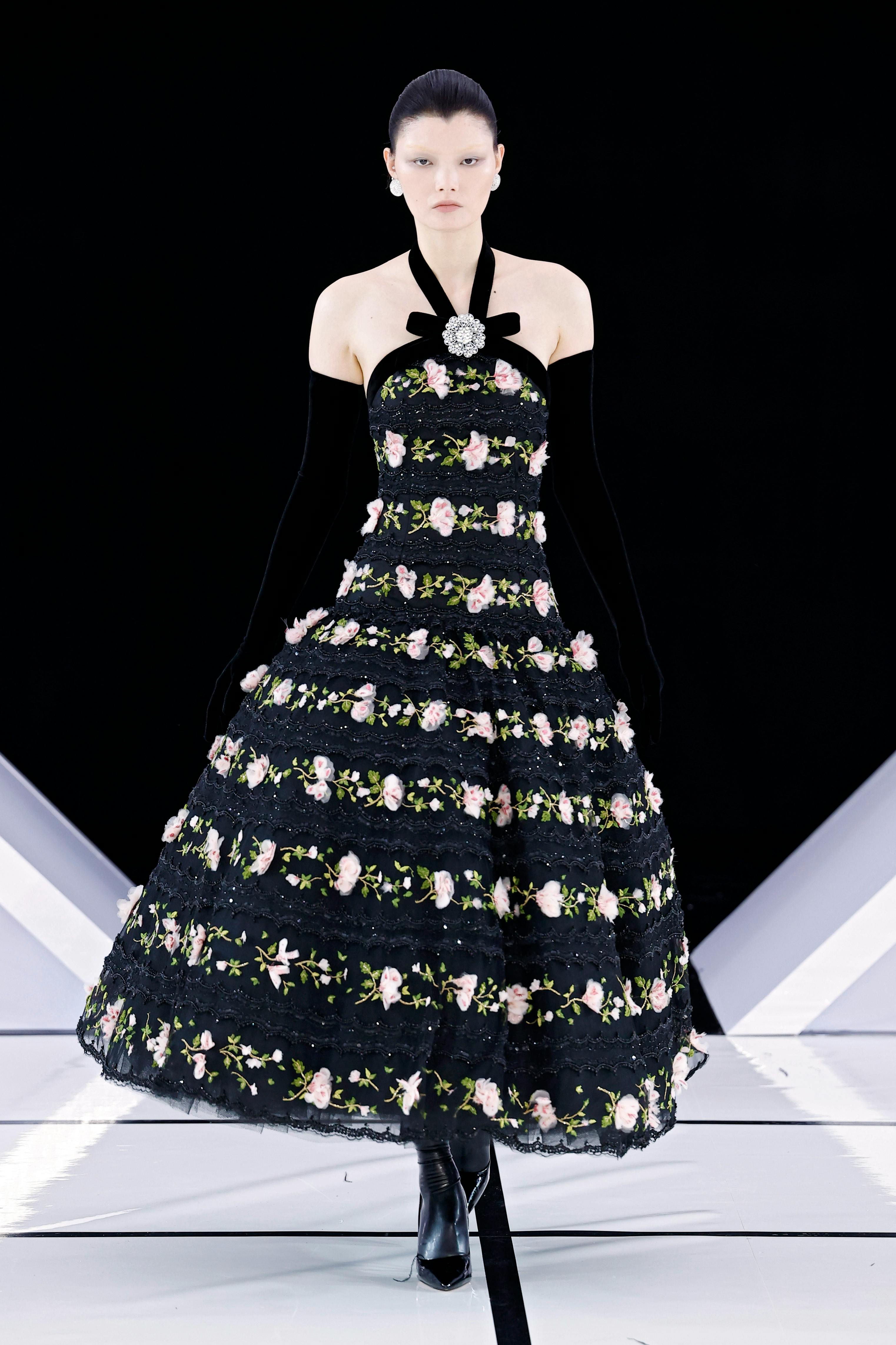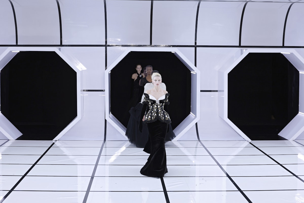Black velvet absorbed the bright runway lights, contrasting with the sparkle of crystals. Long gloves, structured bodices, and floor-length skirts created silhouettes that felt both dramatic and controlled. While the palette remained largely monochromatic, touches of powder pink, acid yellow, and mint satin suggested a subtle shift toward icy pastels for winter.