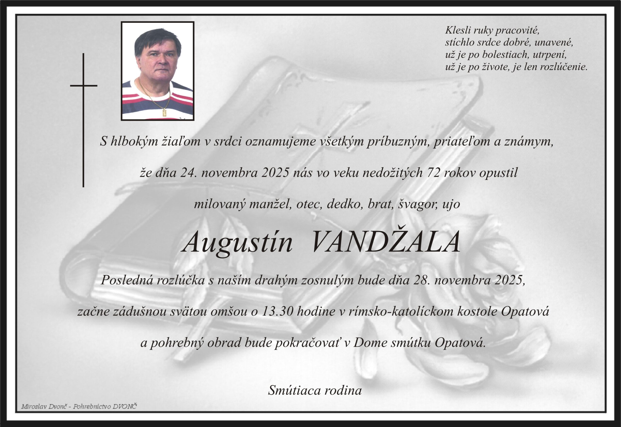 S hlbokým žiaľom oznamujeme všetkým príbuzným, priateľom a známym, že Augustín Vandžala nás opustil(a) dňa: 24.11.2025, vo veku 71 rokov. Posledná rozlúčka sa uskutoční dňa: 28.11.2025.