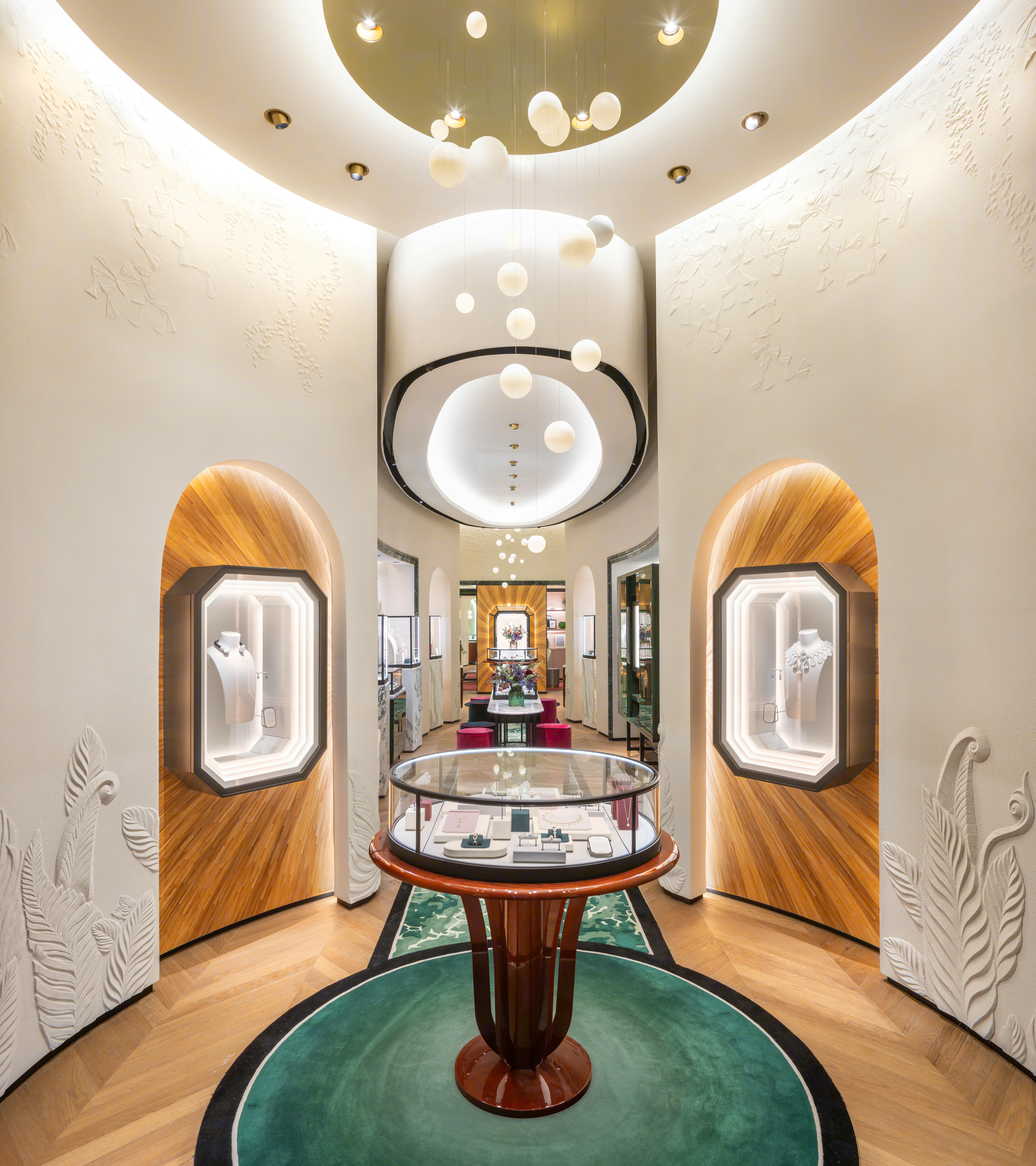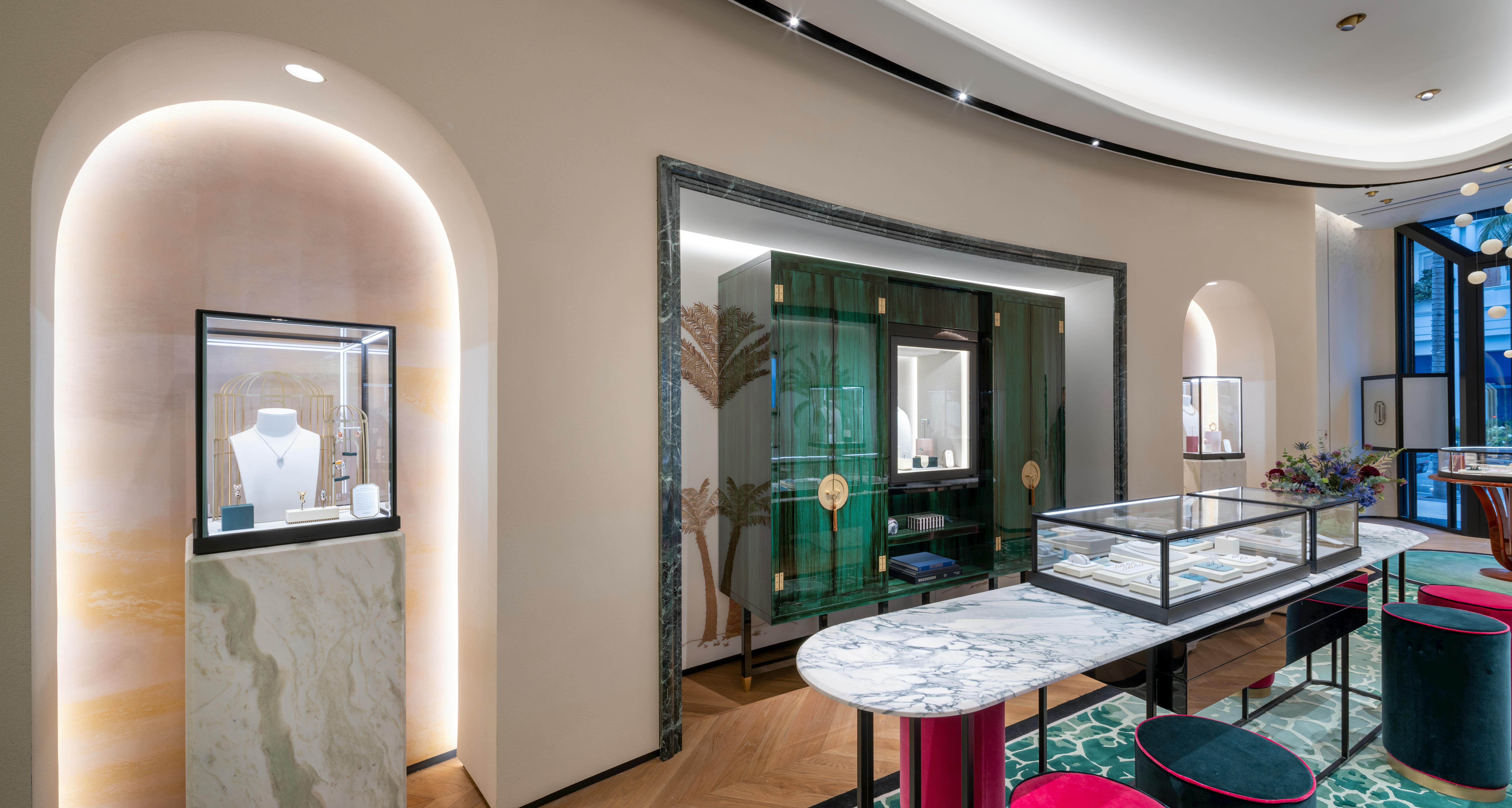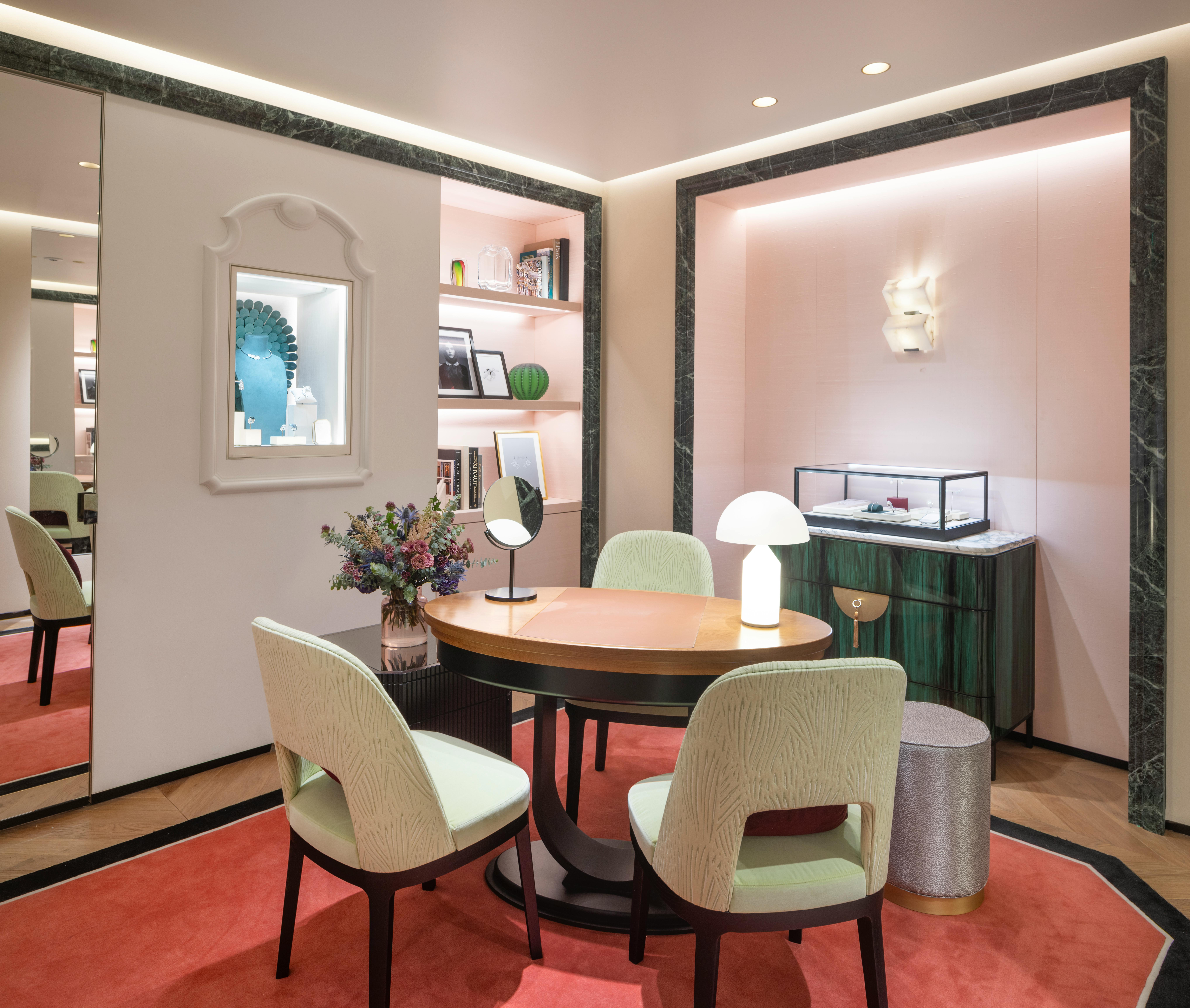 Washed in soft, yet charming green and pink decor, the interior is at once comforting and ultra-chic, resulting in the warm environment that Boucheron has long prided itself on. With walls covered in verdant green bas-reliefs, designed by Atelier D’offard, on the interior walls, Boucheron intertwines nature with artistry, bringing together the maison’s long legacy of excellence in craftsmanship and California’s unique connection to the organic world.