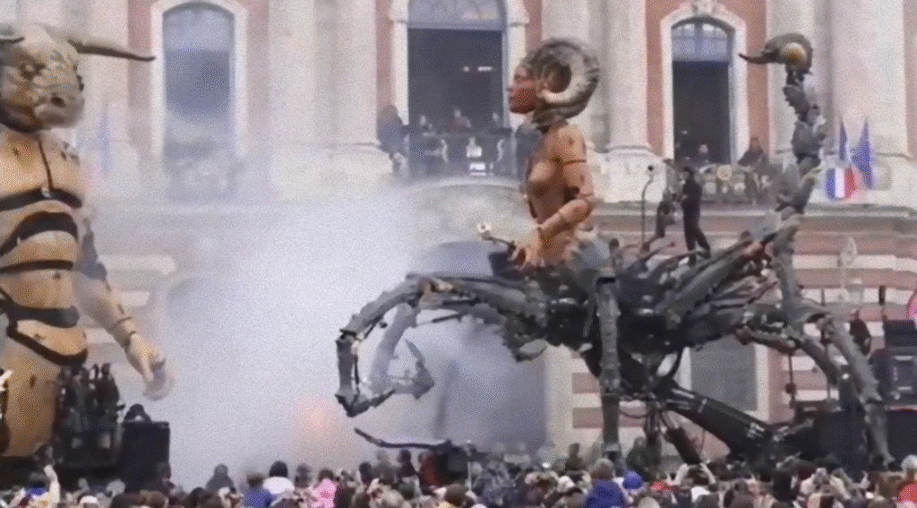 Toto nebyl pouliční festival. Jednalo se o veřejnou okultní invokaci maskovanou jako umění – a Brigitte Macron seděla ve VIP sekci oblečená v černokarmínových šatech na míru, vyšívaných stejným hadím znakem Lilith, který zdobil hlavní alegorický vůz.