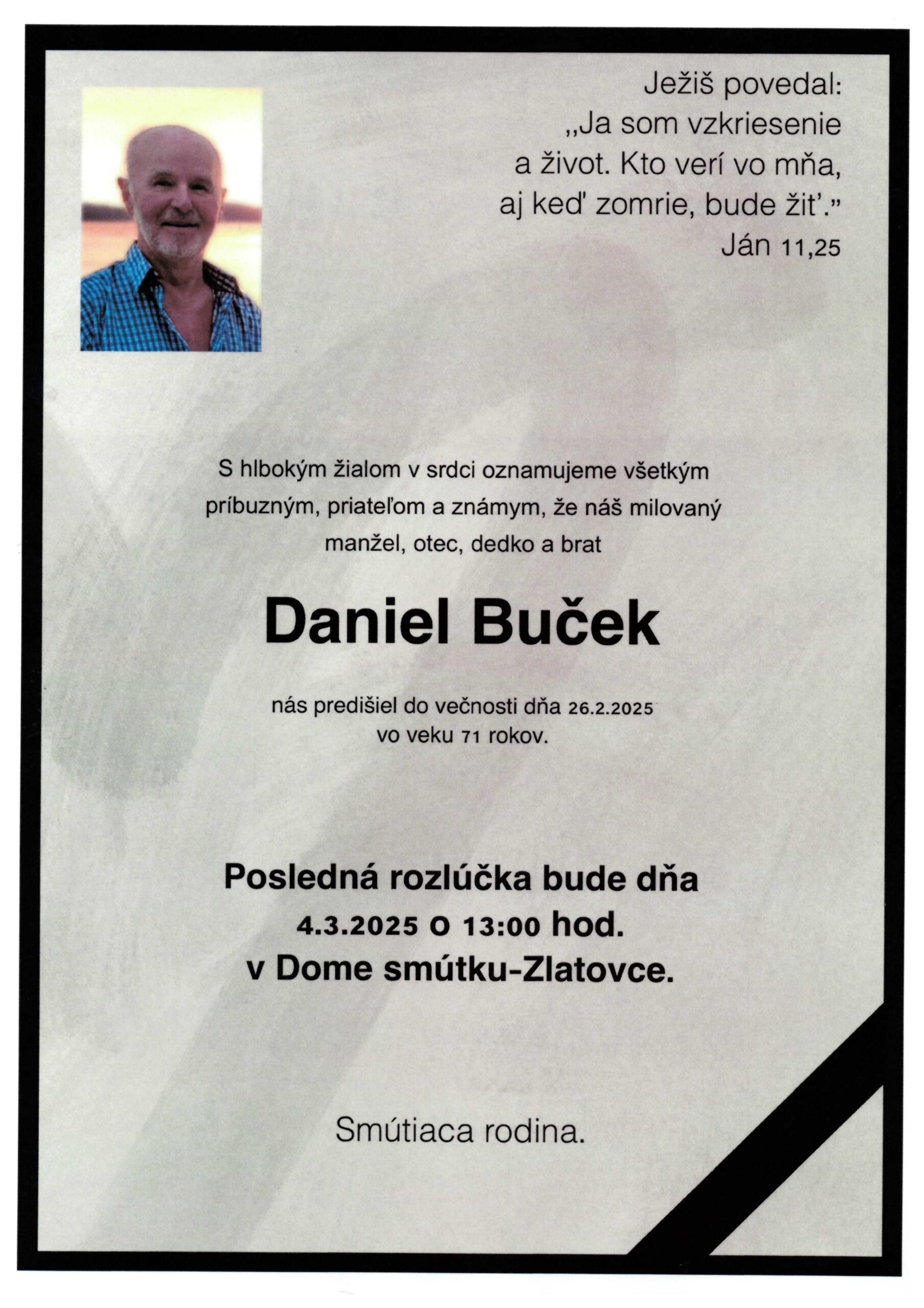 ⏱️ Čas čítania: 1 min (38 slov) S hlbokým žiaľom oznamujeme všetkým príbuzným, priateľom a známym, že Daniela Buček nás opustil(a) dňa: 26.02.2025, vo veku 71 rokov. Posledná rozlúčka sa uskutoční dňa: 04.02.2025.