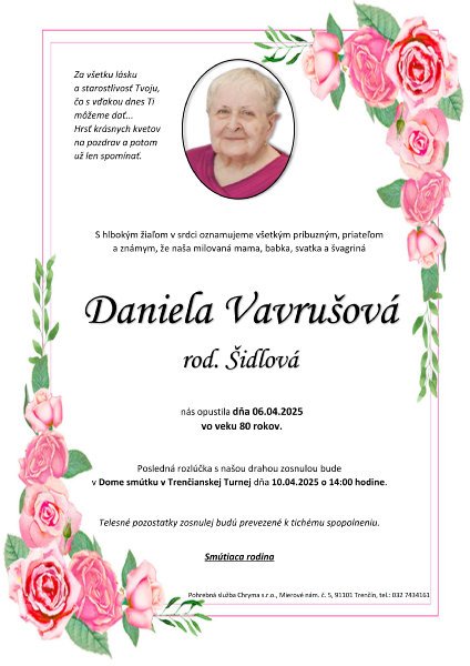 ⏱️ Čas čítania: 1 min (40 slov) S hlbokým žiaľom oznamujeme všetkým príbuzným, priateľom a známym, že Daniela Vavrušová rod. Šidlová nás opustil(a) dňa: 06.04.2025, vo veku 80 rokov. Posledná rozlúčka sa uskutoční dňa: 10.04.2025.