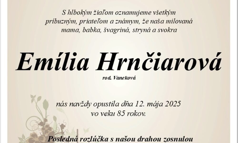 ⏱️ Čas čítania: 1 min (39 slov) S hlbokým žiaľom oznamujeme všetkým príbuzným, priateľom a známym, že Emília Hrnčiarová nás opustil(a) dňa: 12.05.2025, vo veku 85 rokov. Posledná rozlúčka sa uskutoční dňa: 15.05.2025.