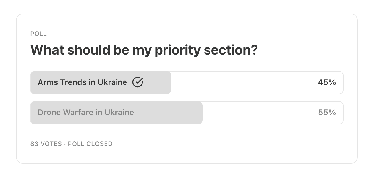 The poll announced in the previous post has ended, and by a relatively small margin of 10%, Drone Warfare in Ukraine was selected as the section that should become my priority. I will make this transition over the next couple of weeks.