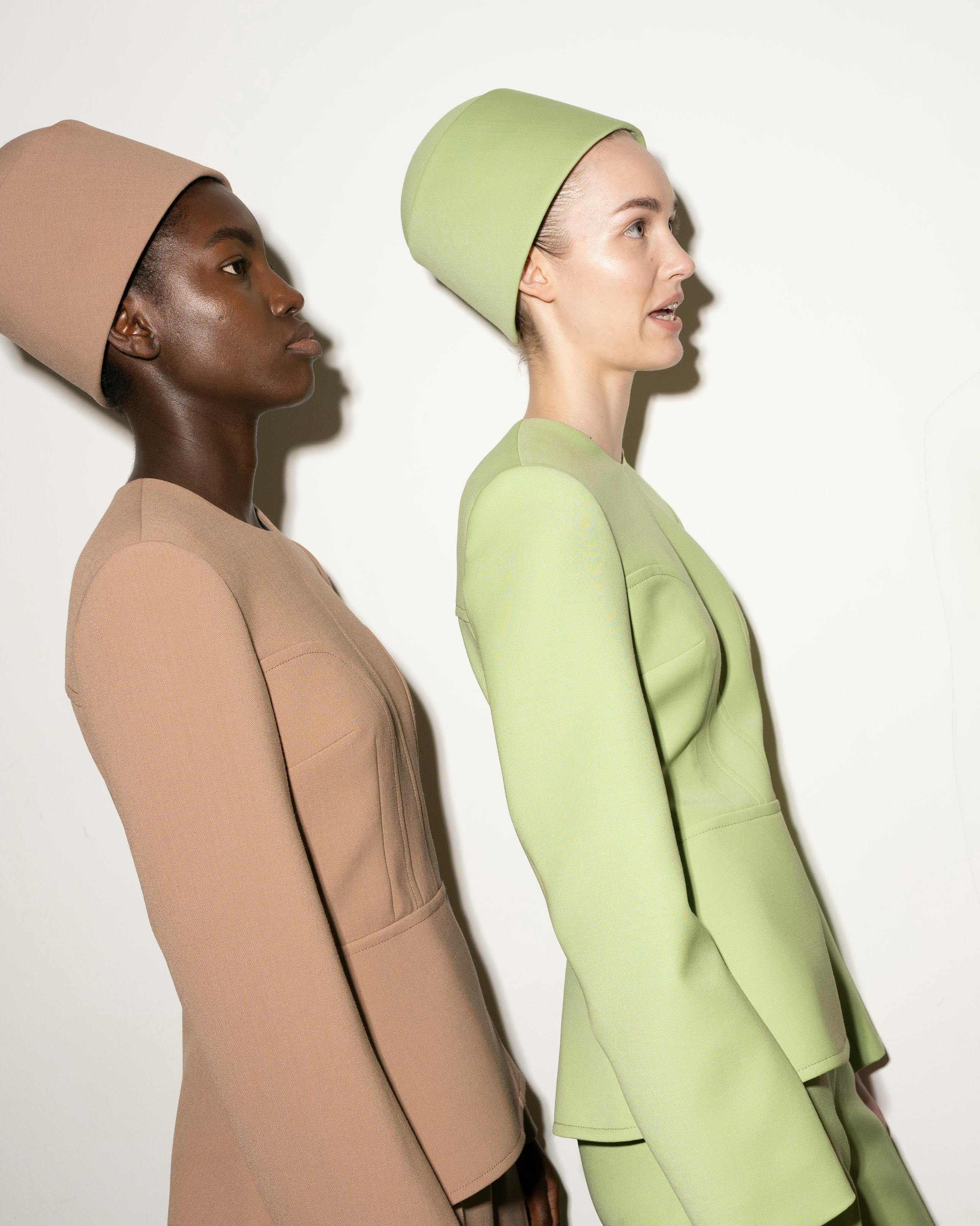 She’s not the only designer turning her gaze skyward this fall. Markarian’s Alexandra O’Neill looked to Tudor grandeur, collaborating with Burris to remix rich jewel-tone brocades from the 1500s with sleek accessories from the 1950s. “The Markarian woman wants to leave the house feeling fully dressed and considered, and punctuating her look with a pillbox hat achieves that,” O’Neill notes. Emilia Wickstead, meanwhile, translated the refined elegance of Edith Head’s costume designs for Alfred Hitchcock’s 1963 masterpiece The Birds into skirt suits styled with custom Laura Cathcart Millinery hats in the same striking chartreuse shade. “That 1960s silhouette can only be completed with a pillbox hat,” Wickstead says. The higher the hat, the closer to grace, it seems.