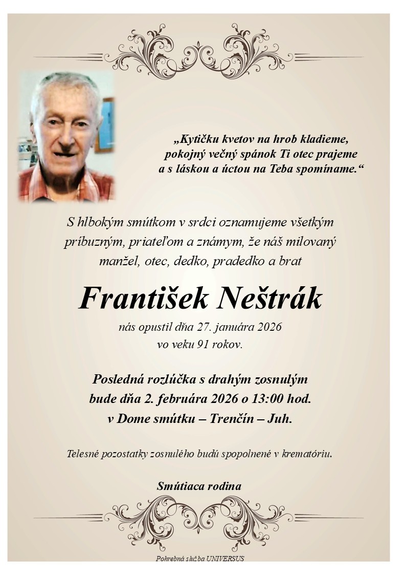 S hlbokým žiaľom oznamujeme všetkým príbuzným, priateľom a známym, že František Neštrák nás opustil(a) dňa: 27.01.2026, vo veku 91 rokov. Posledná rozlúčka sa uskutoční dňa: 02.02.2026.