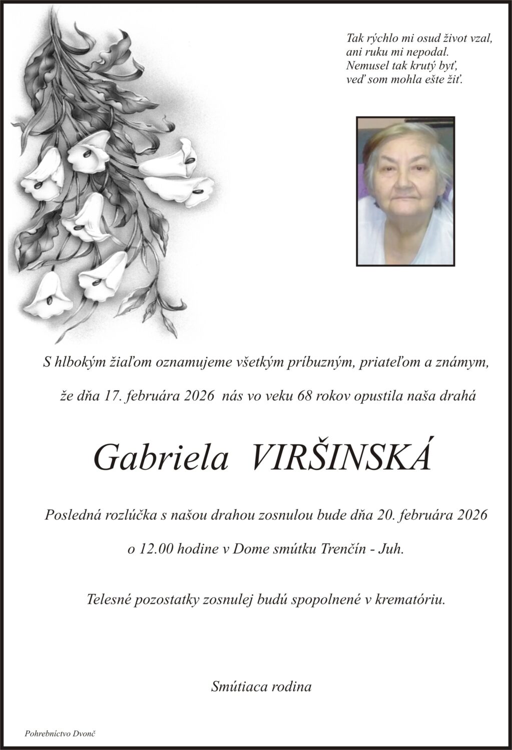 S hlbokým žiaľom oznamujeme všetkým príbuzným, priateľom a známym, že Gabriela Viršinská nás opustil(a) dňa: 17.02.2026, vo veku 68 rokov. Posledná rozlúčka sa uskutoční dňa: 20.02.2026.