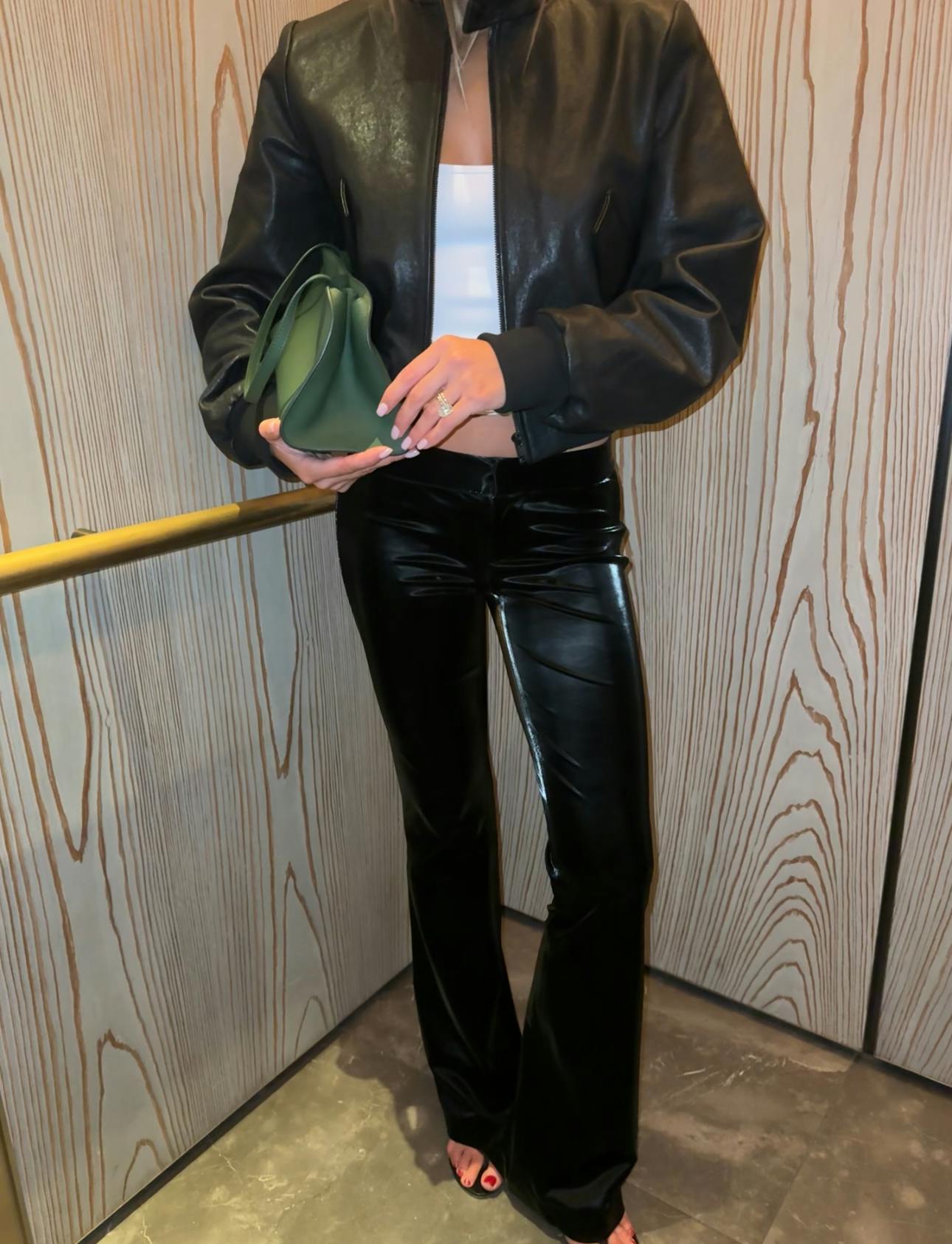 EP: I didn’t do too much skin prep today, other than my daily moisturizer, like I talked about before. I did a light glam. I used my go-to foundation by Makeup Forever and a few new products I’ve been excited to try out, like Kosas’s eye brightener and Laura Mercier’s caviar eye pencil in forbidden rose! For the outfit, I wanted to be comfortable and confident. I wore a gorgeous pair of Alice and Olivia low-rise leather pants with a basic Tank Air tank and my new Frame leather bomber. To tie in some team spirit, I paired it with a Celtics baseball hat and a green Peggy bag from The Row! I also had to wear The Row’s flip-flop heels because I got a major blister from all the walking I did today.