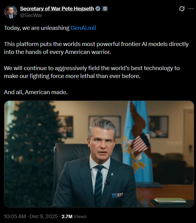 “I am pleased to introduce GenAI.mil, a secure generative AI platform for every member of the Department of War. It is live today and available on the desktops of all military personnel, civilians and contractors. With this launch, we are taking a giant step toward mass AI adoption across the department. This tool marks the beginning of a new era, where every member of our workforce can be more efficient and impactful.