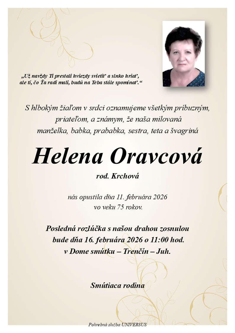 S hlbokým žiaľom oznamujeme všetkým príbuzným, priateľom a známym, že Helena Oravcová nás opustil(a) dňa: 11.02.2026, vo veku 75 rokov. Posledná rozlúčka sa uskutoční dňa: 16.02.2026.