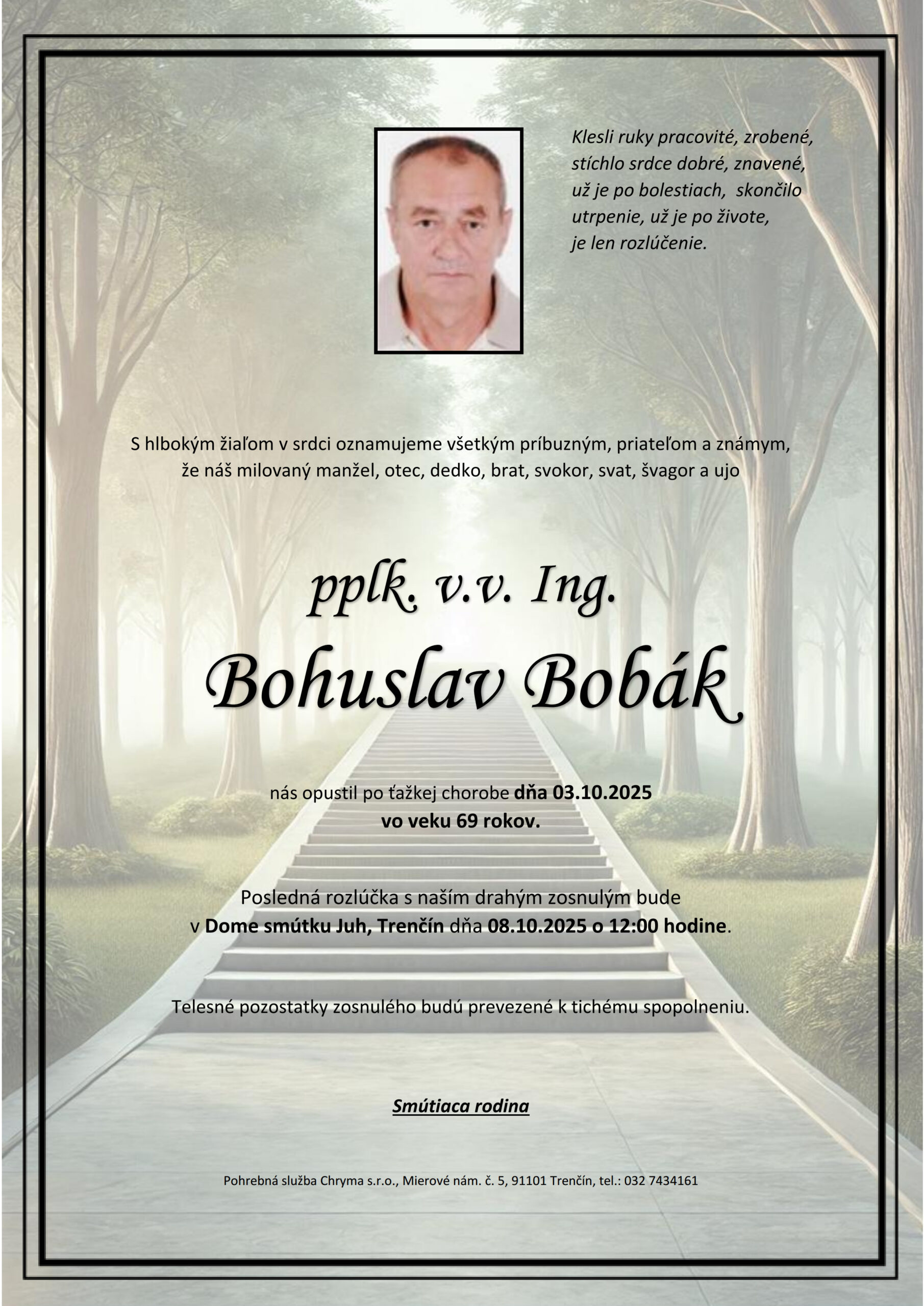 S hlbokým žiaľom oznamujeme všetkým príbuzným, priateľom a známym, že Ing. Bohuslav Bobák nás opustil(a) dňa: 03.10.2025, vo veku 69 rokov. Posledná rozlúčka sa uskutoční dňa: 08.10.2025.