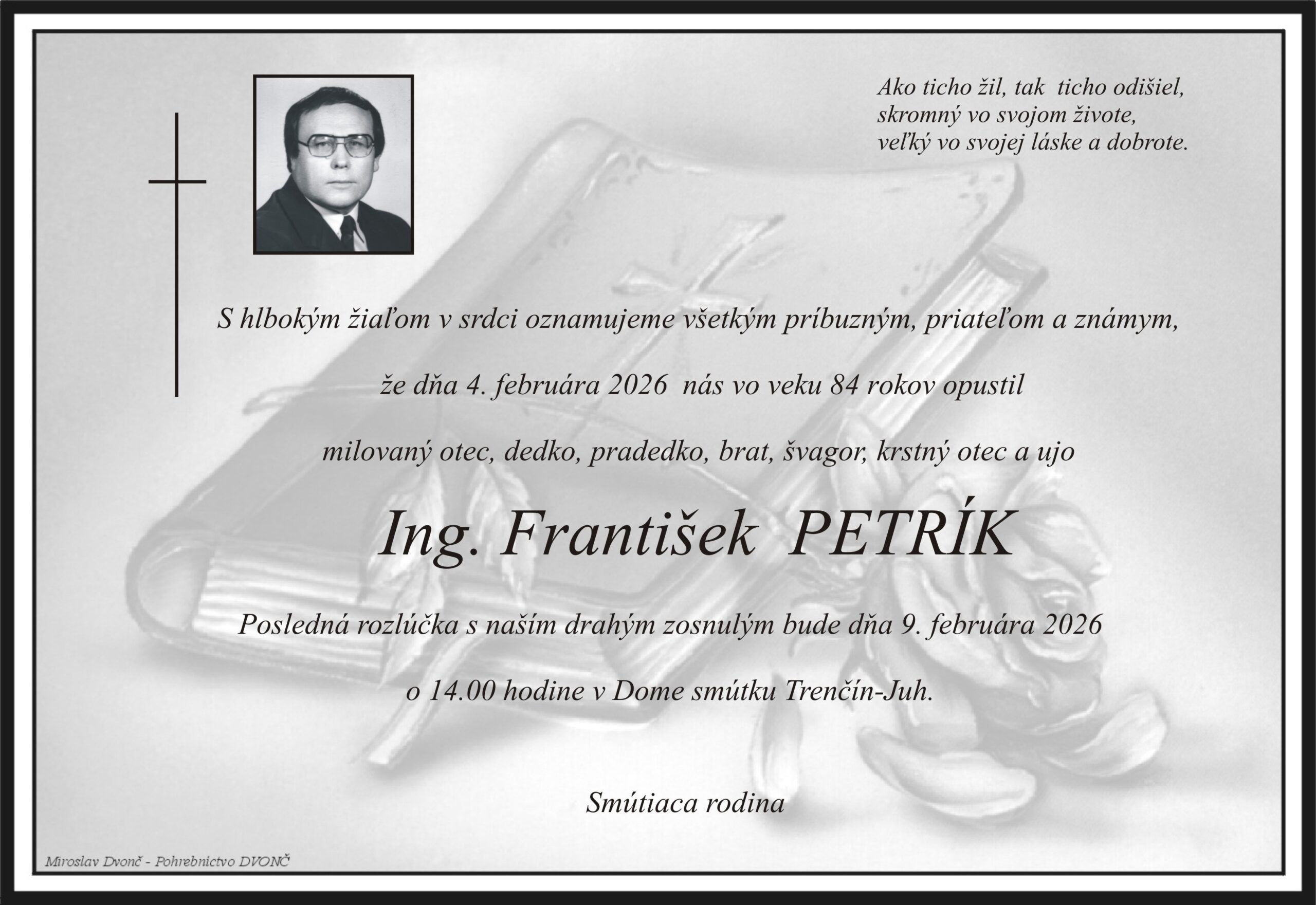 S hlbokým žiaľom oznamujeme všetkým príbuzným, priateľom a známym, že Ing. František Petrík nás opustil(a) dňa: 04.02.2026, vo veku 84 rokov. Posledná rozlúčka sa uskutoční dňa: 09.02.2026.