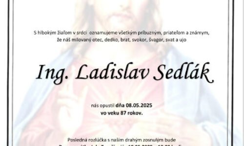 ⏱️ Čas čítania: 1 min (39 slov) S hlbokým žiaľom oznamujeme všetkým príbuzným, priateľom a známym, že Ing. Ladislav Sedlák nás opustil(a) dňa: 08.05.2025, vo veku 87 rokov. Posledná rozlúčka sa uskutoční dňa: 10.05.2025.