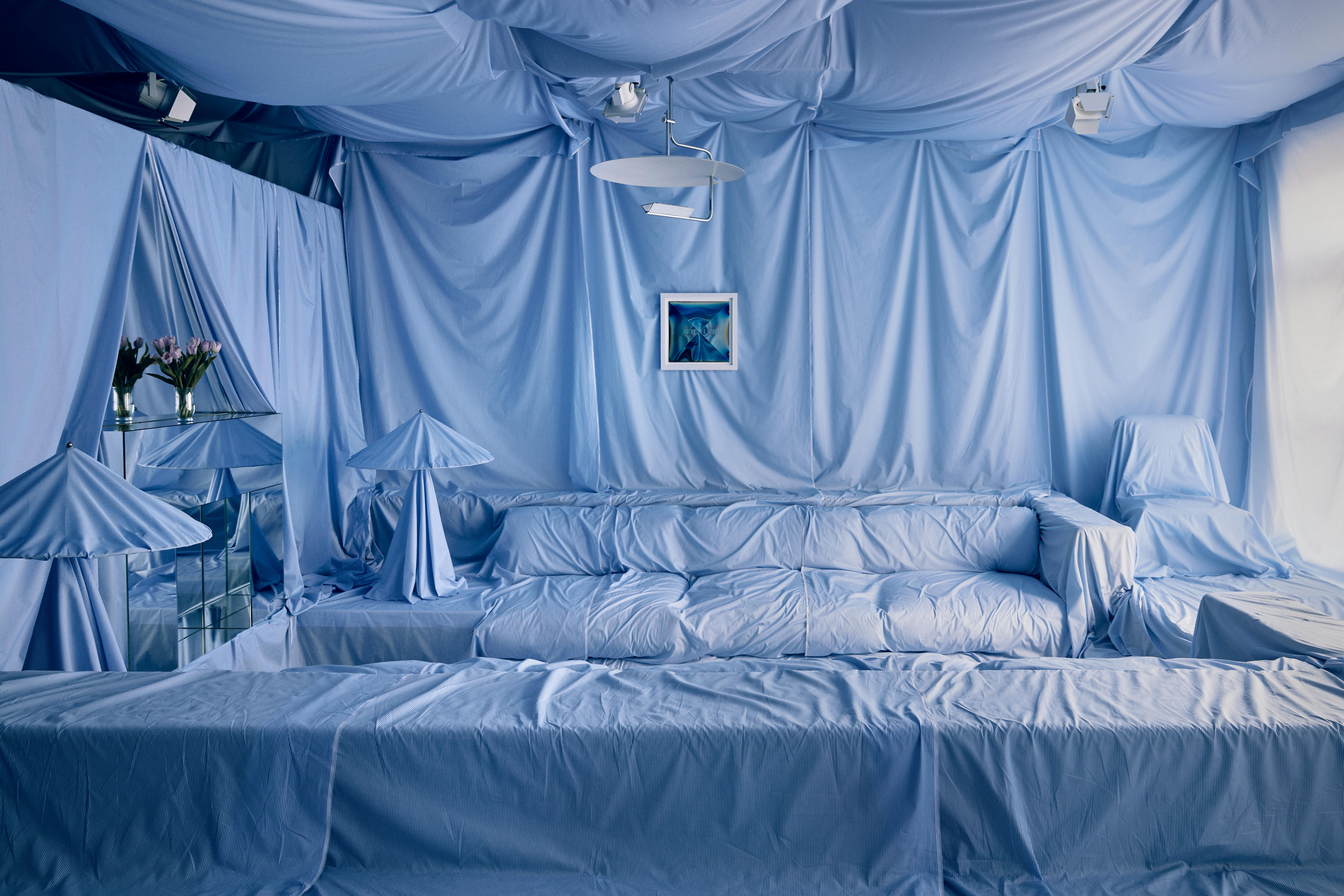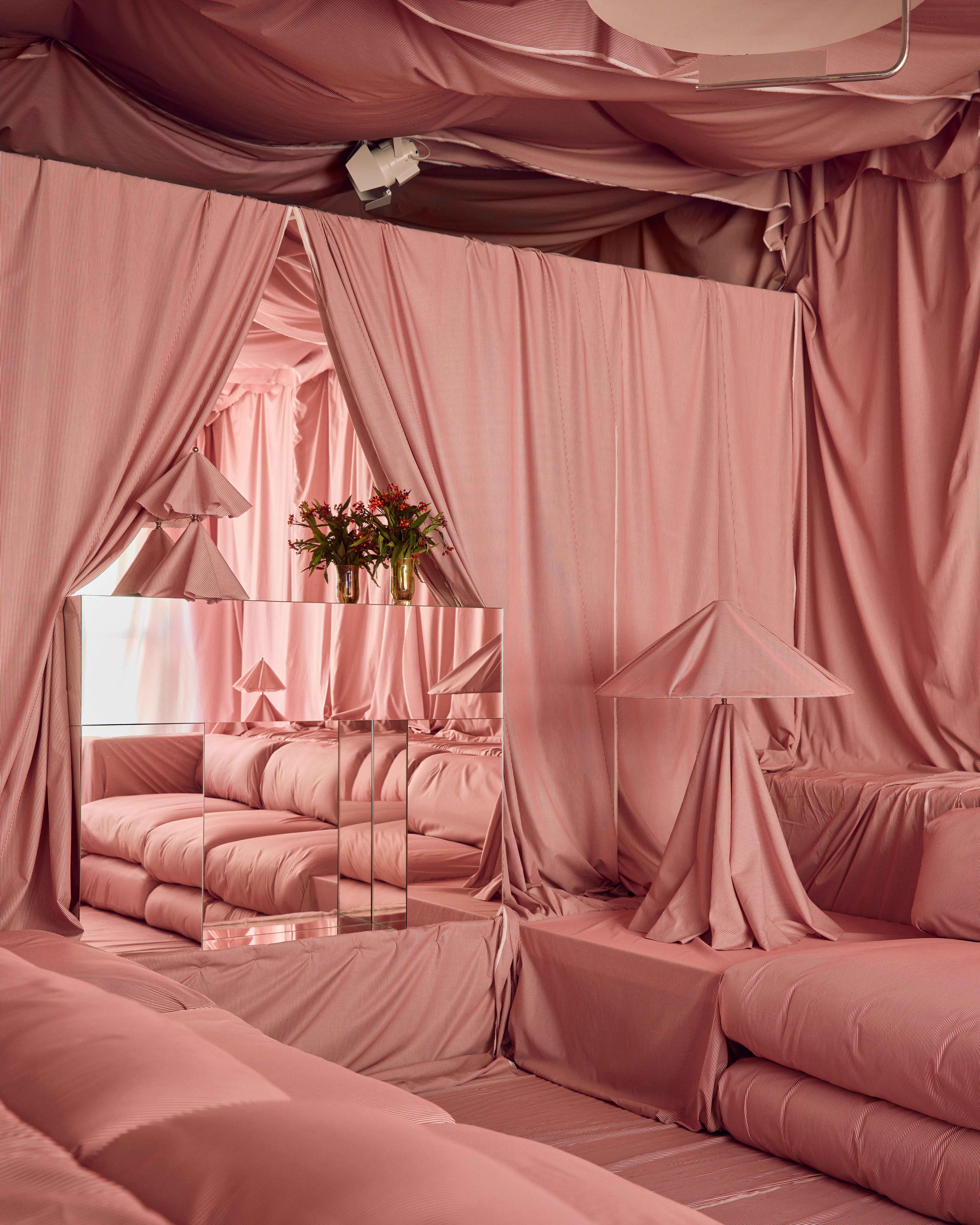 Cooper, the founder and creative force behind the William White universe, sees fabric as a kind of architecture—one that moves, adapts, and responds to the body in a way traditional walls never could. “I’ve always been enamored with the idea of a soft partition,” he says. “It has mobility; it has flexibility; it has character. It lets you move the space instead of building a wall.” His latest draped installations, first tested in his Canal Street studio and reimagined in new iterations for Printemps New York, embody that approach. These enveloping environments create a “womb-like” sensation where floor, wall, and ceiling dissolve into a single monochrome material. The effect is a dichotomy of sorts: disorienting and calming; a world that feels suspended, softened, and intimate.