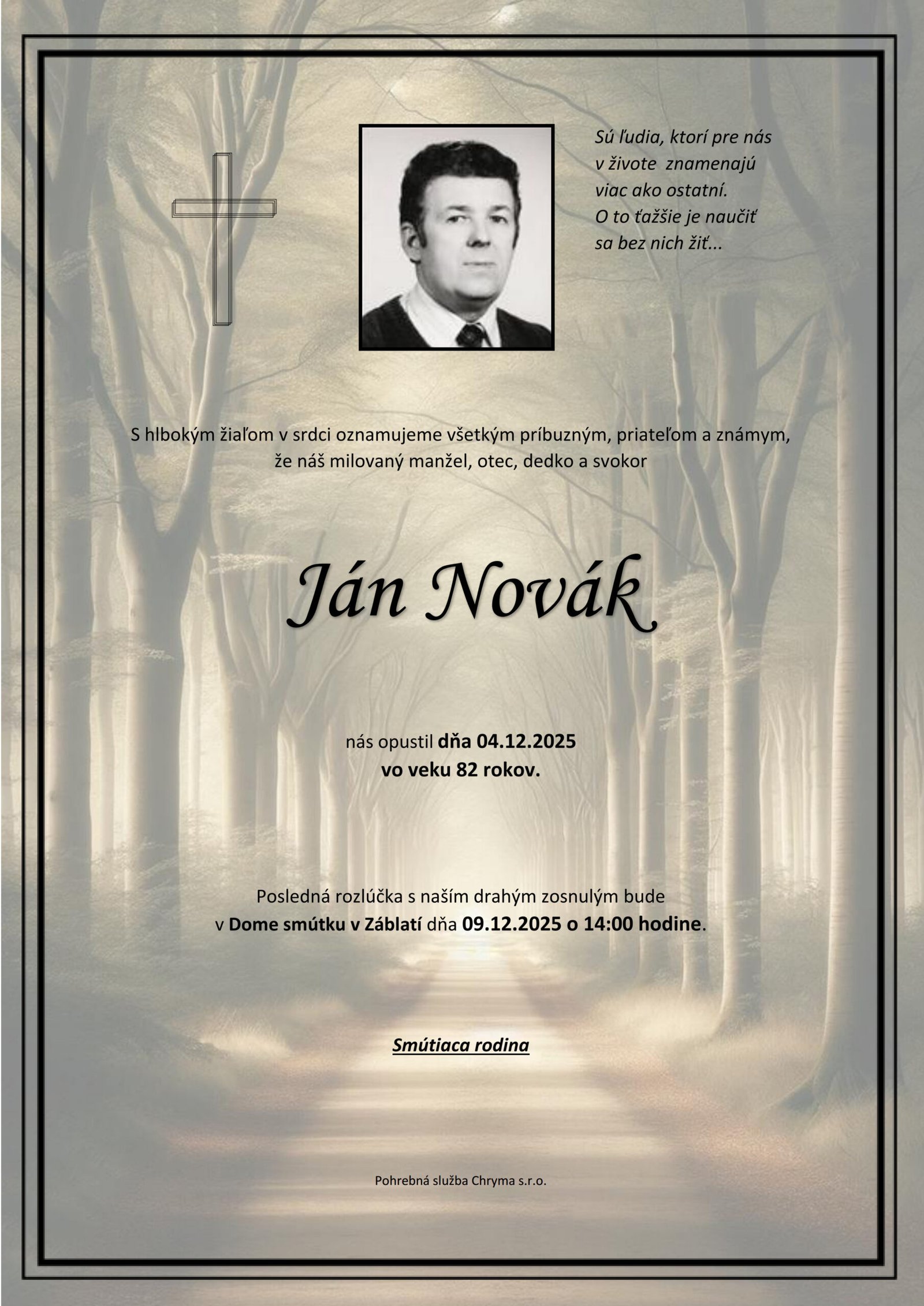 ⏱️ Čas čítania: 1 min (39 slov) S hlbokým žiaľom oznamujeme všetkým príbuzným, priateľom a známym, že Ján Novák nás opustil(a) dňa: 04.12.2025, vo veku 82 rokov. Posledná rozlúčka sa uskutoční dňa: 09.12.2025.