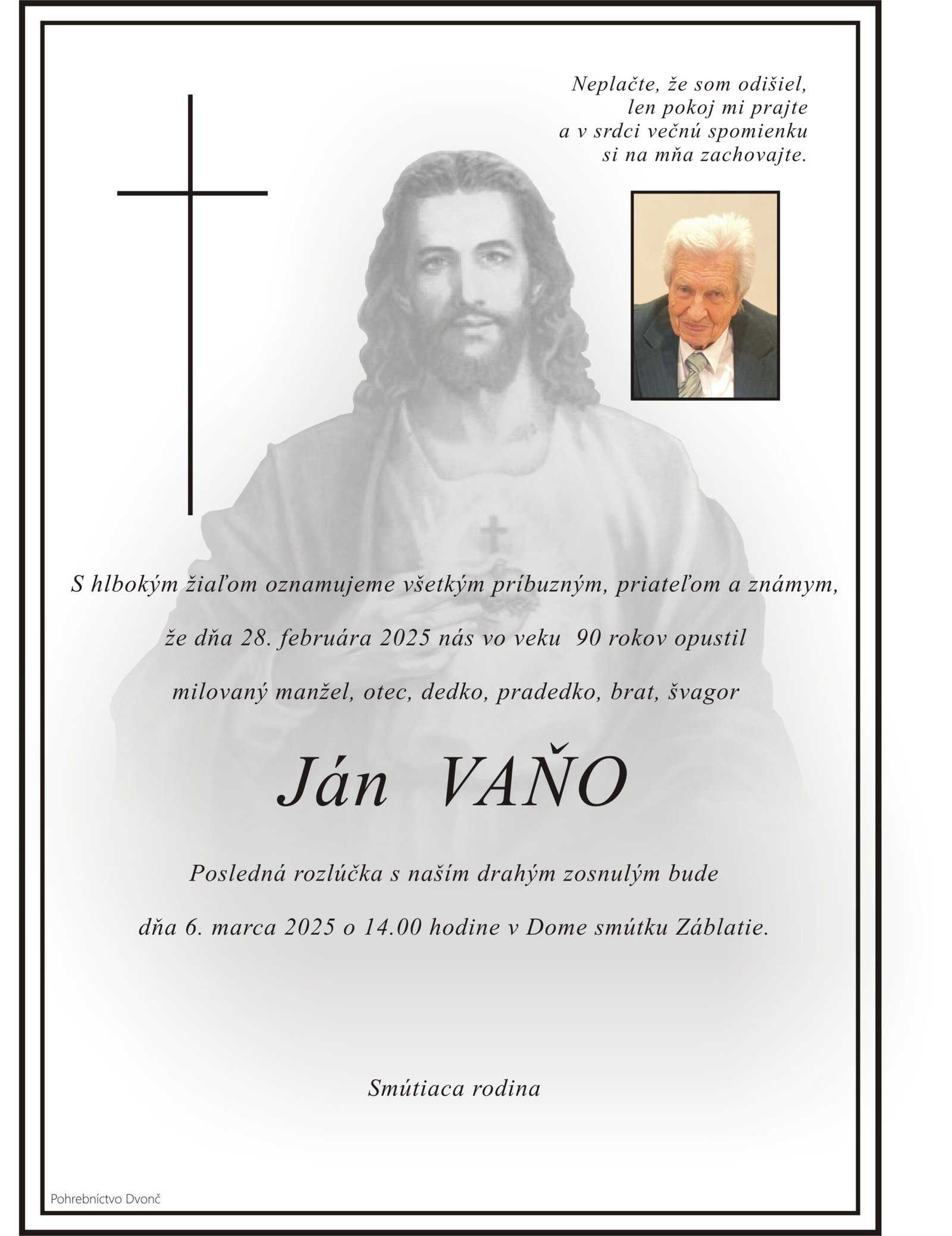 ⏱️ Čas čítania: 1 min (39 slov) S hlbokým žiaľom oznamujeme všetkým príbuzným, priateľom a známym, že Ján Vaňo nás opustil(a) dňa: 28.02.2025, vo veku 90 rokov. Posledná rozlúčka sa uskutoční dňa: 06.03.2025.