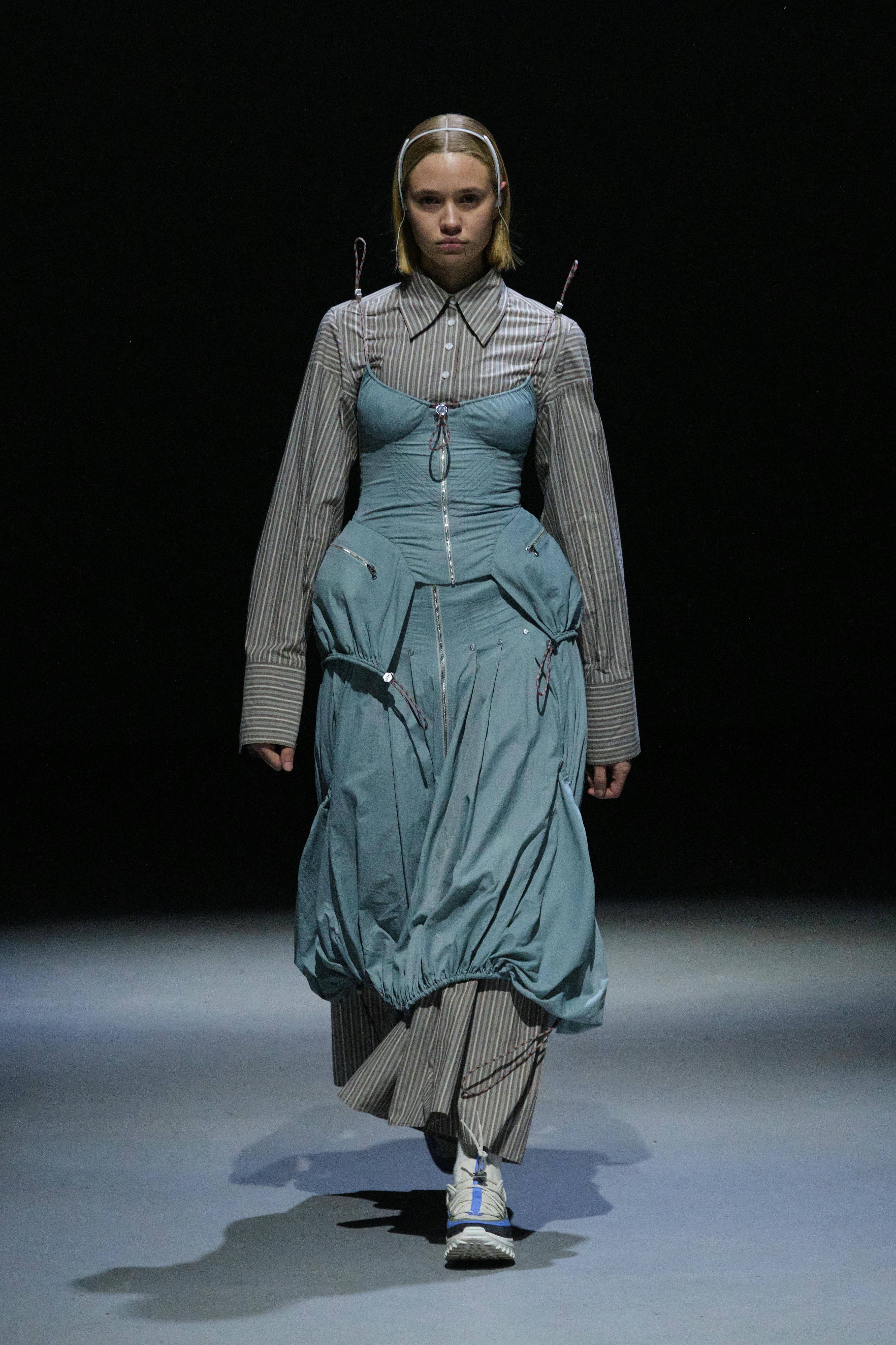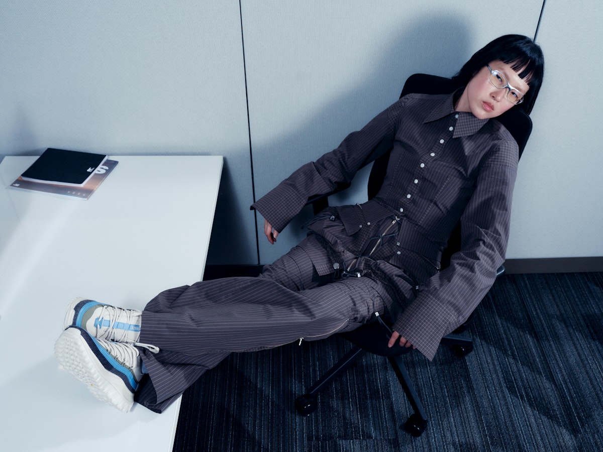 If Wade’s work has always lived in the space between utility and narrative, this season pushes it further into technical terrain. Nylons, tent-like constructions, trail-runner archetypes, and avalanche rescue references weave throughout the collection. “You’ll see ski lift operators, snow cat drivers, avalanche rescue crew—all of these characters she’s meeting along the way,” Wade tells L’OFFICIEL. The result feels cinematic, but grounded in real gear.