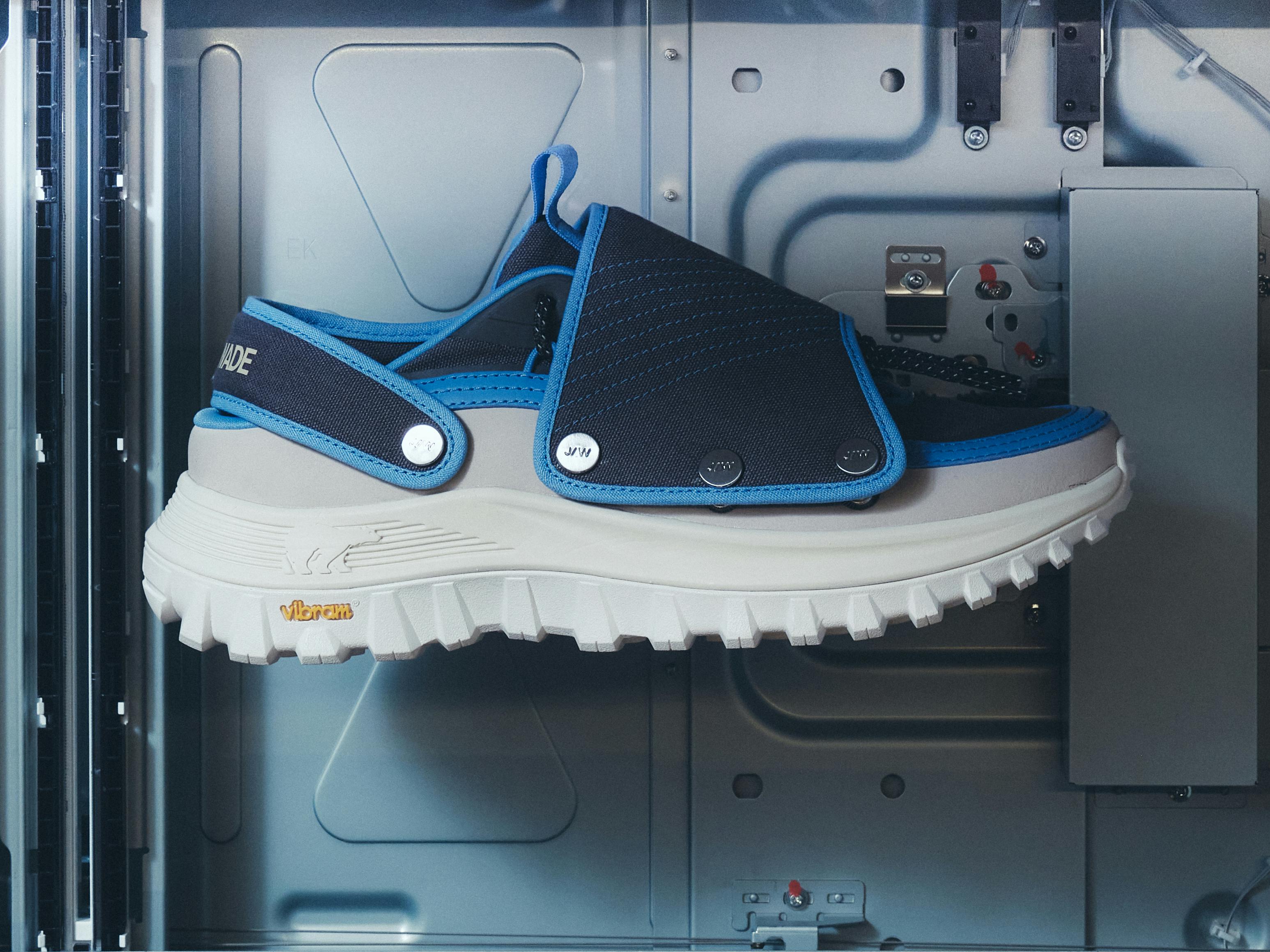 The collaboration ultimately grew into four styles. Two thigh-high runway-exclusive boots—one in cowhide, one in canvas —lean into Wade’s workwear storytelling, complete with adjustable zippers and snaps. A sneaker arrives in her signature blue colorway, mixing cowhide hair with canvas. And then there’s the mule: a convertible slide with a removable lace cover, something she “really fought for.”