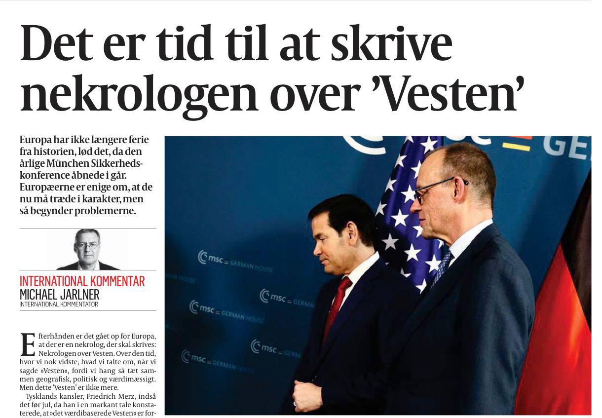 „Európa si postupne uvedomila, že treba napísať nekrológ: nekrológ pre Západ. Nekrológ pre časy, keď sme dobre vedeli, o čom hovoríme pri vyslovení slova „Západ“, pretože sme boli úzko prepojení geograficky, politicky a hodnotovo. Ale ten „Západ“ už neexistuje… Ideál svetového poriadku založeného na pravidlách, ktorý by priznával rovnaké práva veľkým aj malým štátom, bol nahradený zákonom džungle. Veľmoci šikanujú ostatných, pretože „takto to proste je“, ako hovoria. USA chcú ovládnuť západnú pologuľu a vlastniť Grónsko.“
