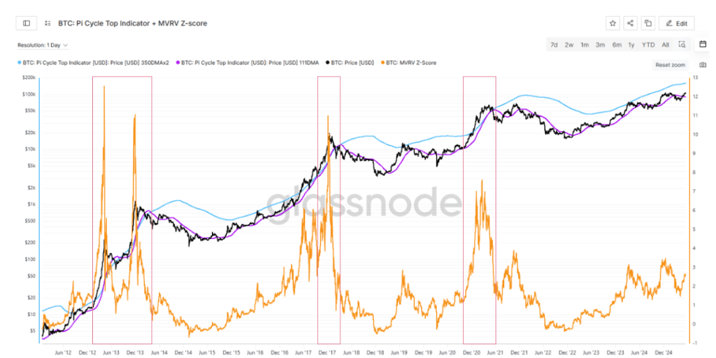 Kombinácia MVRV-Z a Pi Cycle Top v jednom grafe historicky signalizovala záver býčieho behu.