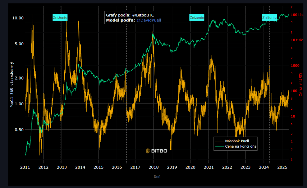 Puell Multiple porovnáva denný príjem ťažiarov s jeho ročným priemerom. Vysoké hodnoty (>3) v minulosti signalizovali, že ťažiari začínajú predávať.