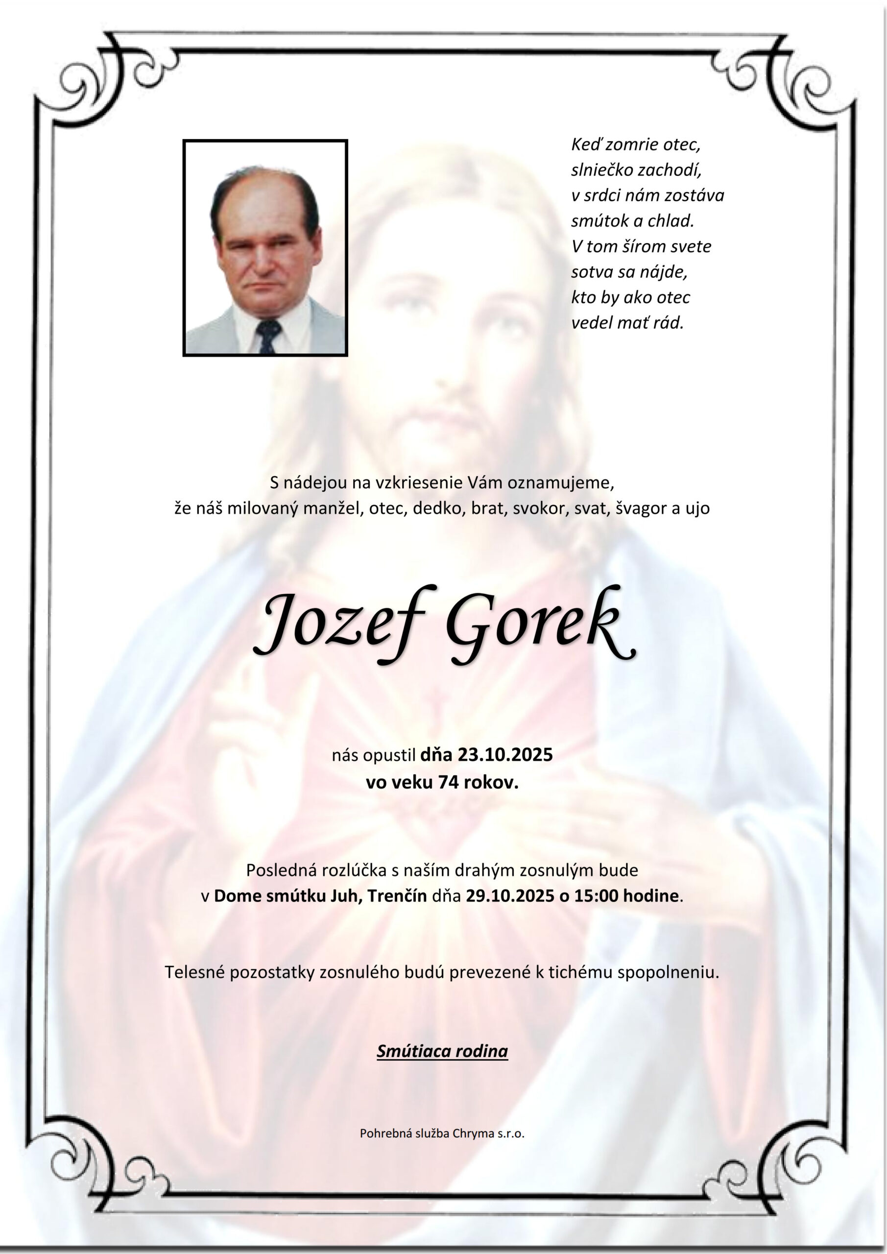 S hlbokým žiaľom oznamujeme všetkým príbuzným, priateľom a známym, že Jozef Gorek nás opustil(a) dňa: 23.10.2025, vo veku 74 rokov. Posledná rozlúčka sa uskutoční dňa: 29.10.2025.