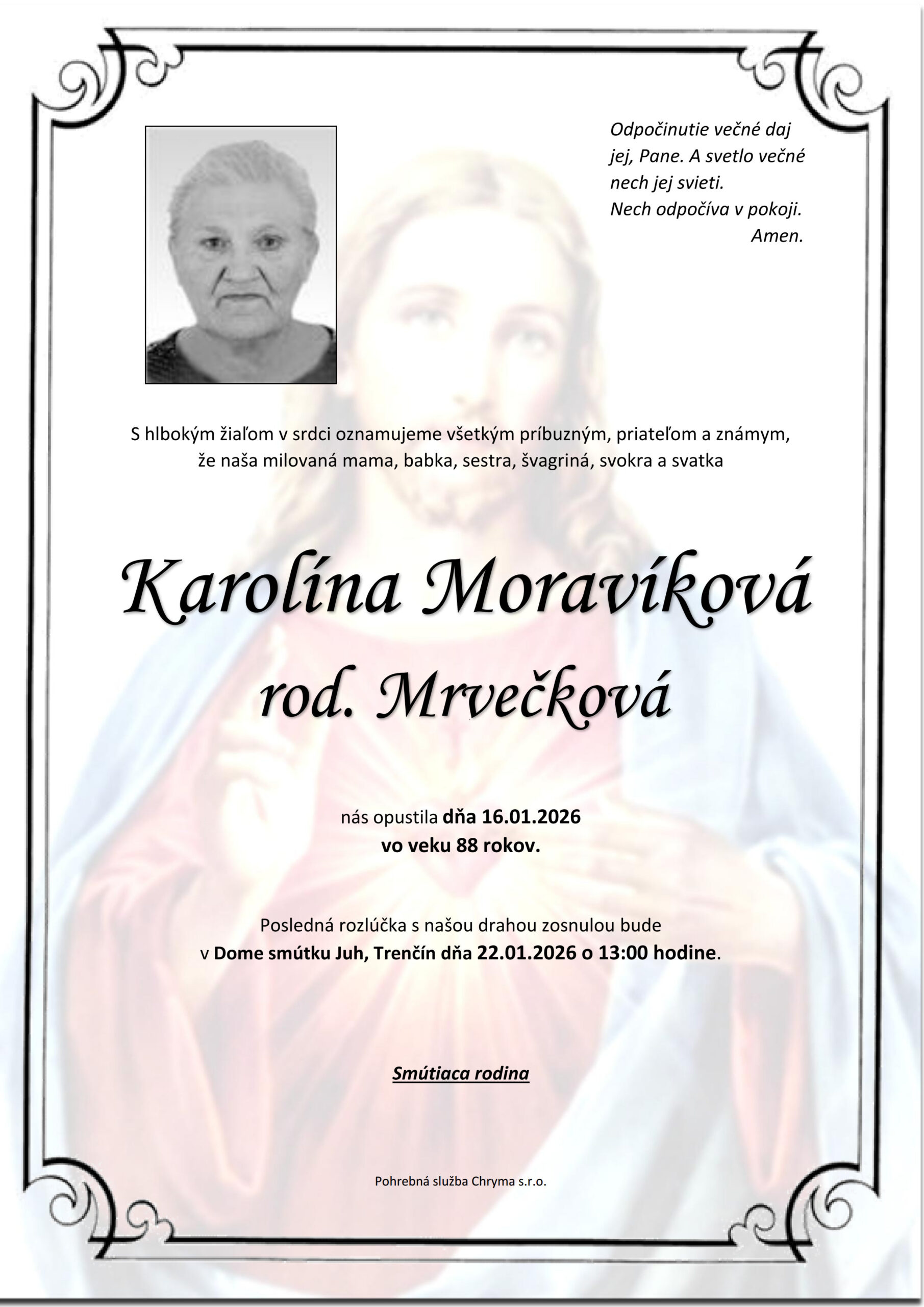 S hlbokým žiaľom oznamujeme všetkým príbuzným, priateľom a známym, že Karolína Moravíková rod. Mrvečková nás opustil(a) dňa: 16.01.2026, vo veku 88 rokov. Posledná rozlúčka sa uskutoční dňa: 22.01.2026.