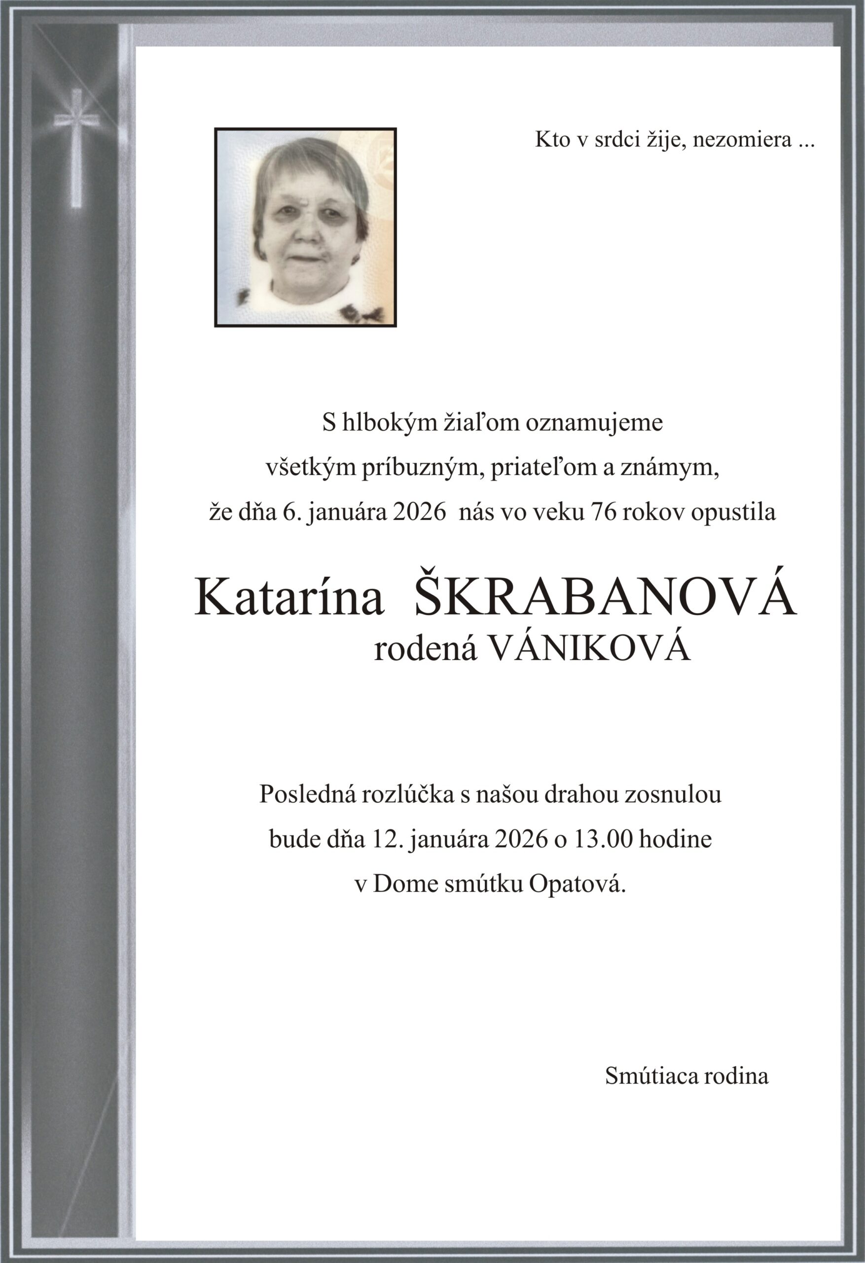 ⏱️ Čas čítania: 1 min (38 slov) S hlbokým žiaľom oznamujeme všetkým príbuzným, priateľom a známym, že Katarína Škrabanová nás opustil(a) dňa: 06.01.2026, vo veku 76 rokov. Posledná rozlúčka sa uskutoční dňa: 12.01.2026.