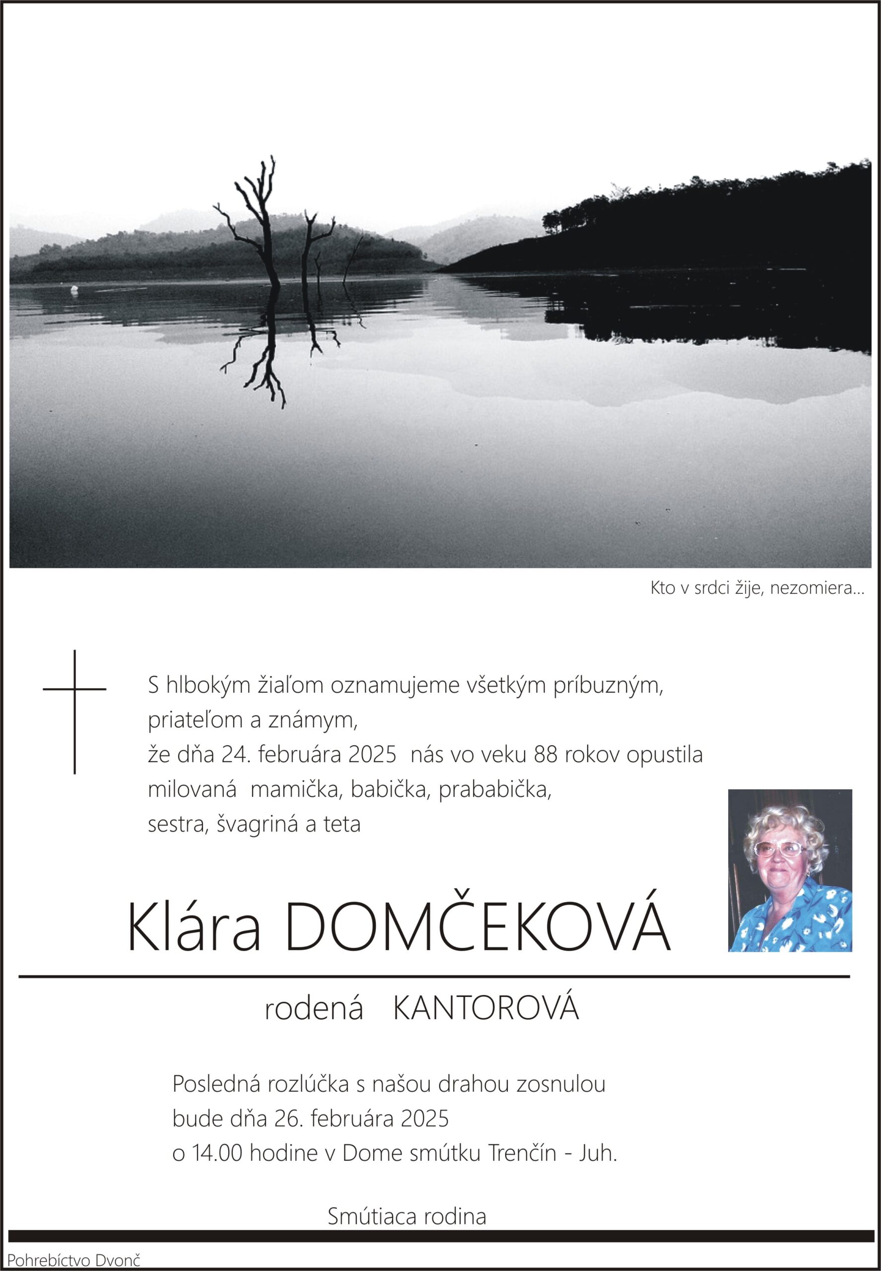 ⏱️ Čas čítania: 1 min (39 slov) S hlbokým žiaľom oznamujeme všetkým príbuzným, priateľom a známym, že Klára Domčeková nás opustil(a) dňa: 24.02.2025, vo veku 88 rokov. Posledná rozlúčka sa uskutoční dňa: 26.02.2025.