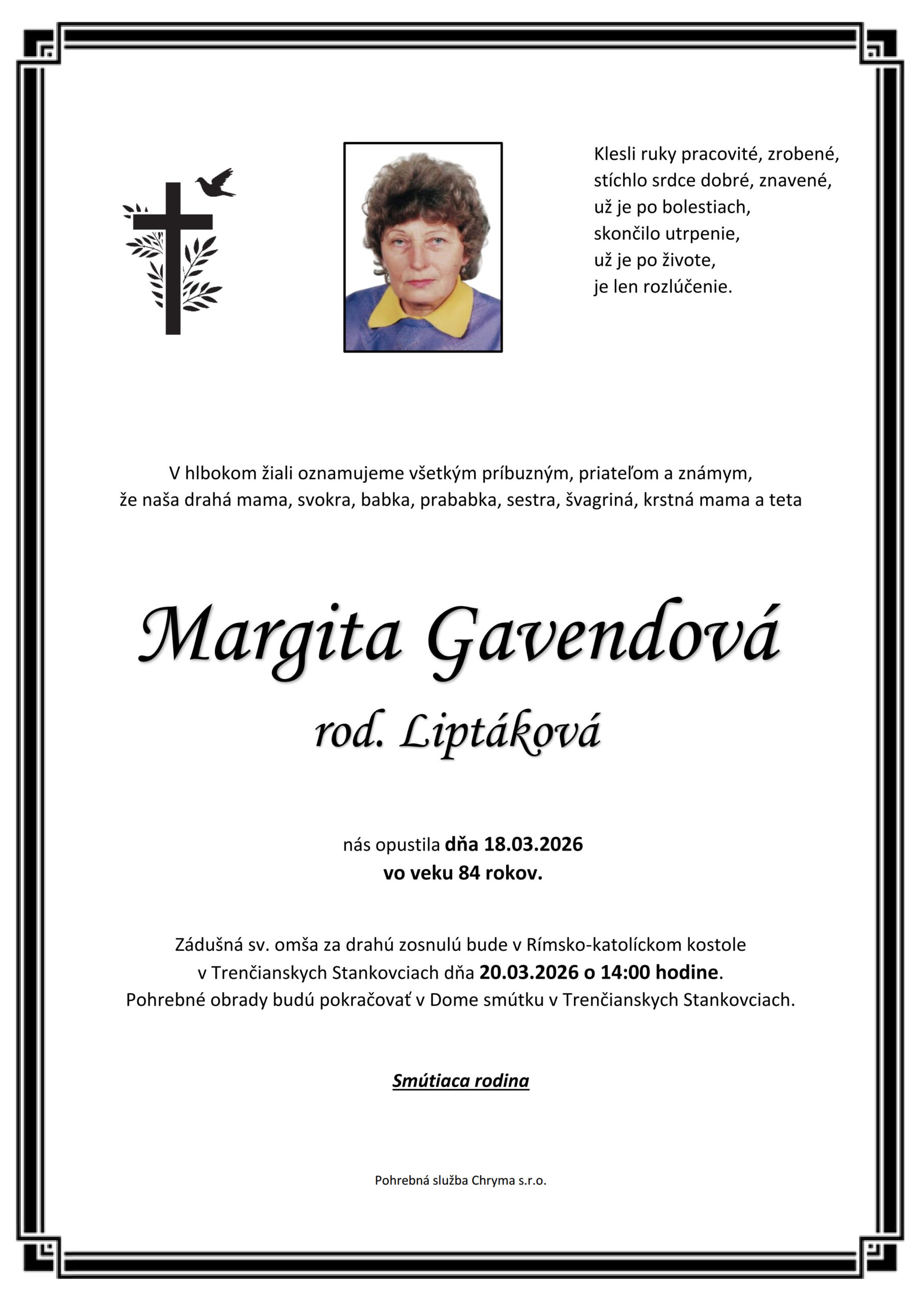 S hlbokým žiaľom oznamujeme všetkým príbuzným, priateľom a známym, že Margita Gavendová rod. Liptáková nás opustil(a) dňa: 18.03.2026, vo veku 84 rokov. Posledná rozlúčka sa uskutoční dňa: 20.03.2026.