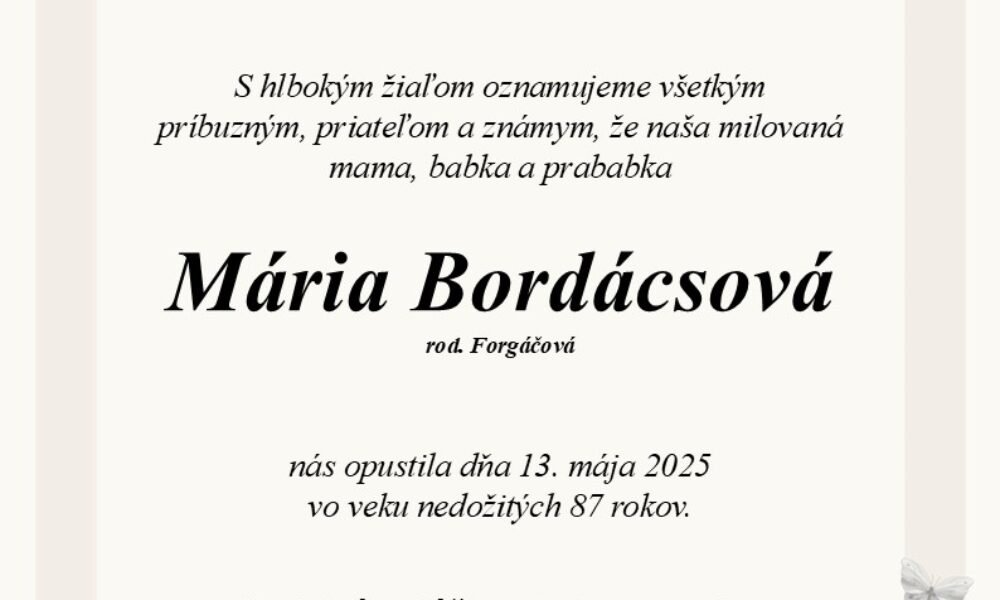 ⏱️ Čas čítania: 1 min (39 slov) S hlbokým žiaľom oznamujeme všetkým príbuzným, priateľom a známym, že Mária Bordácsová nás opustil(a) dňa: 13.05.2025, vo veku 86 rokov. Posledná rozlúčka sa uskutoční dňa: 16.05.2025.