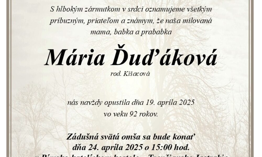 ⏱️ Čas čítania: 1 min (39 slov) S hlbokým žiaľom oznamujeme všetkým príbuzným, priateľom a známym, že Mária Ďuďáková nás opustil(a) dňa: 19.04.2025, vo veku 92 rokov. Posledná rozlúčka sa uskutoční dňa: 24.04.2025.