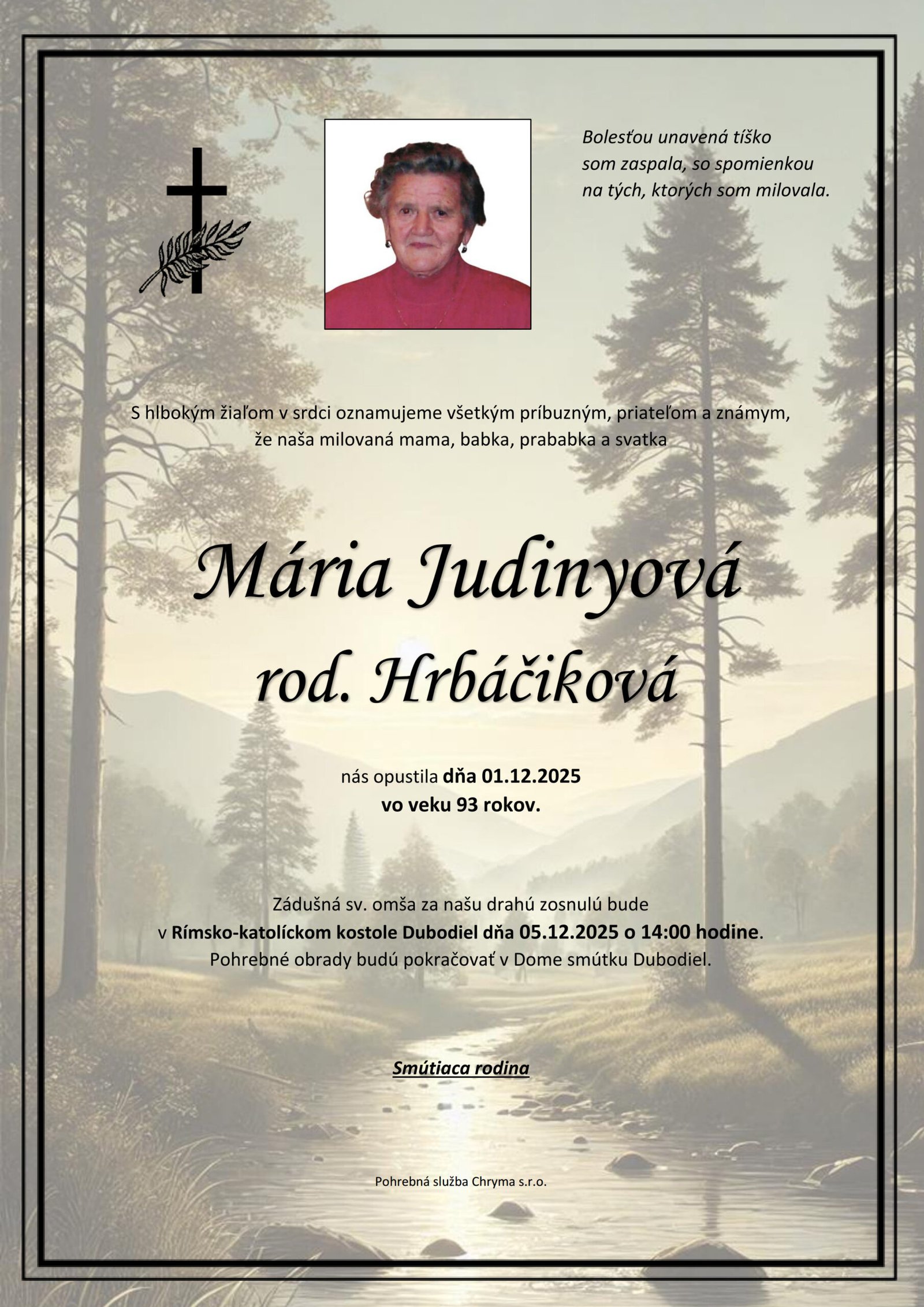 ⏱️ Čas čítania: 1 min (41 slov) S hlbokým žiaľom oznamujeme všetkým príbuzným, priateľom a známym, že Mária Judinyová rod. Hrbáčiková nás opustil(a) dňa: 01.12.2025, vo veku 93 rokov. Posledná rozlúčka sa uskutoční dňa: 05.12.2025.