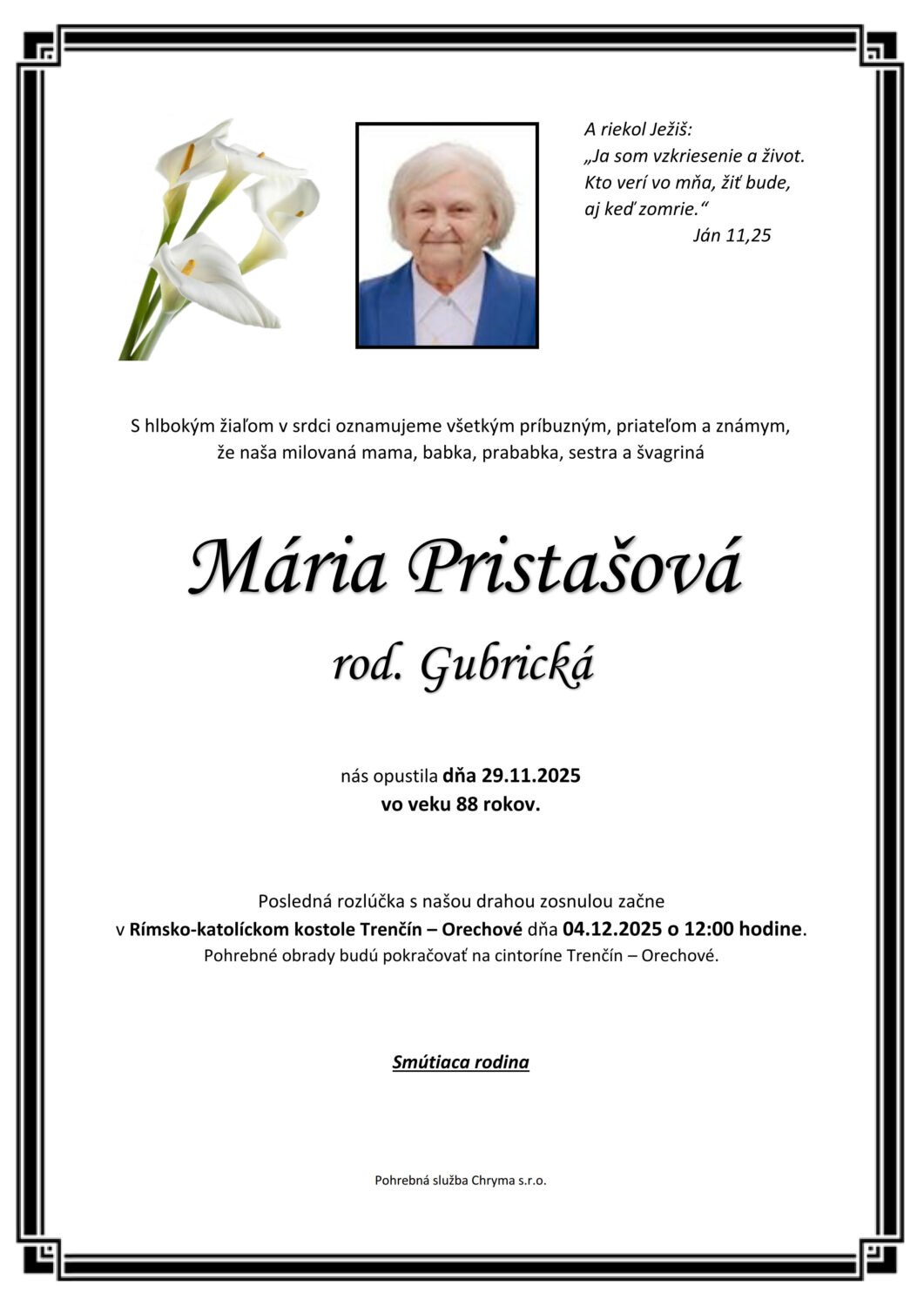 S hlbokým žiaľom oznamujeme všetkým príbuzným, priateľom a známym, že Mária Pristašová rod. Gubrická nás opustil(a) dňa: 29.11.2025, vo veku 88 rokov. Posledná rozlúčka sa uskutoční dňa: 04.12.2025.