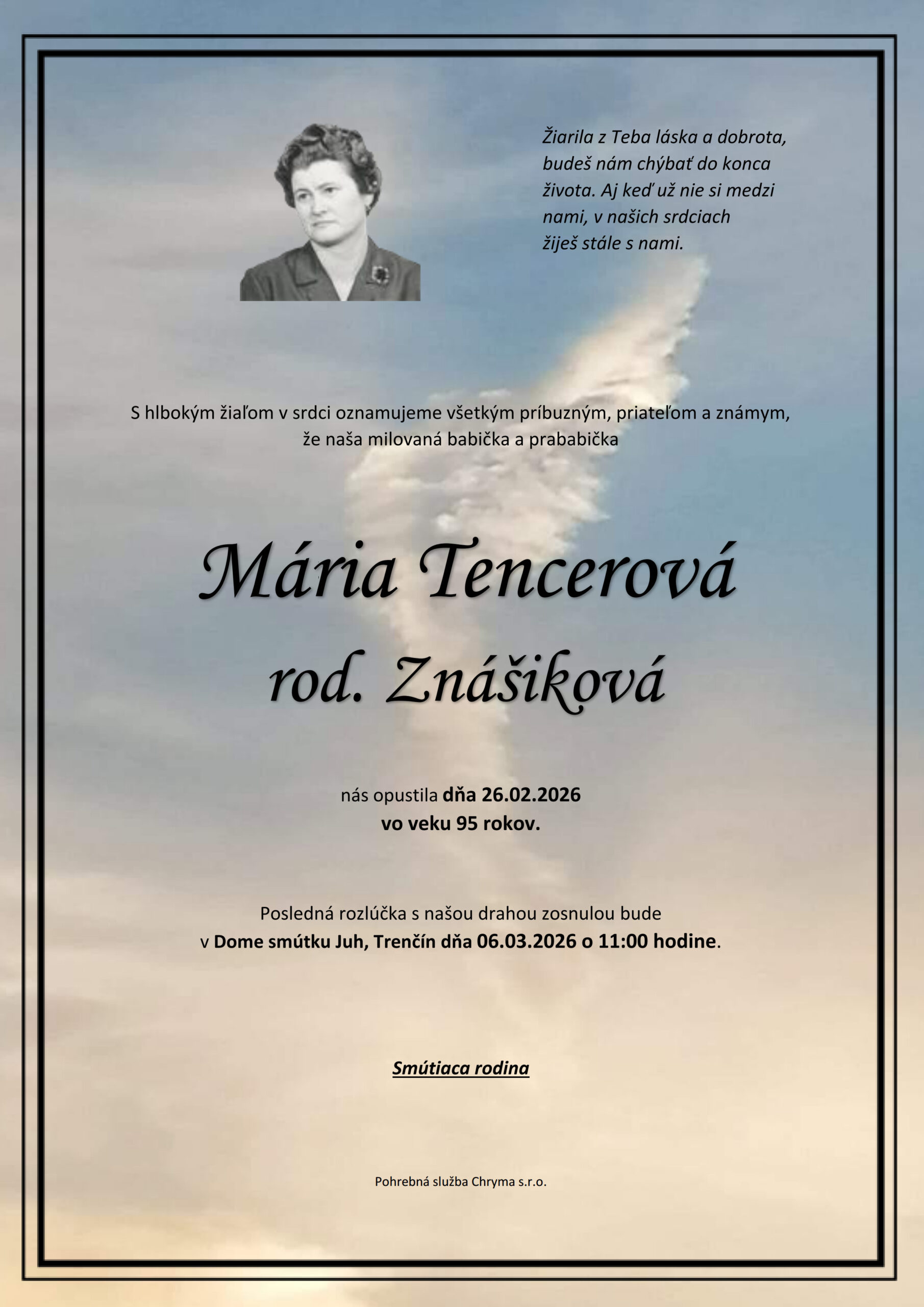 S hlbokým žiaľom oznamujeme všetkým príbuzným, priateľom a známym, že Mária Tencerová rod. Znášiková nás opustil(a) dňa: 26.02.2026, vo veku 95 rokov. Posledná rozlúčka sa uskutoční dňa: 06.03.2026.