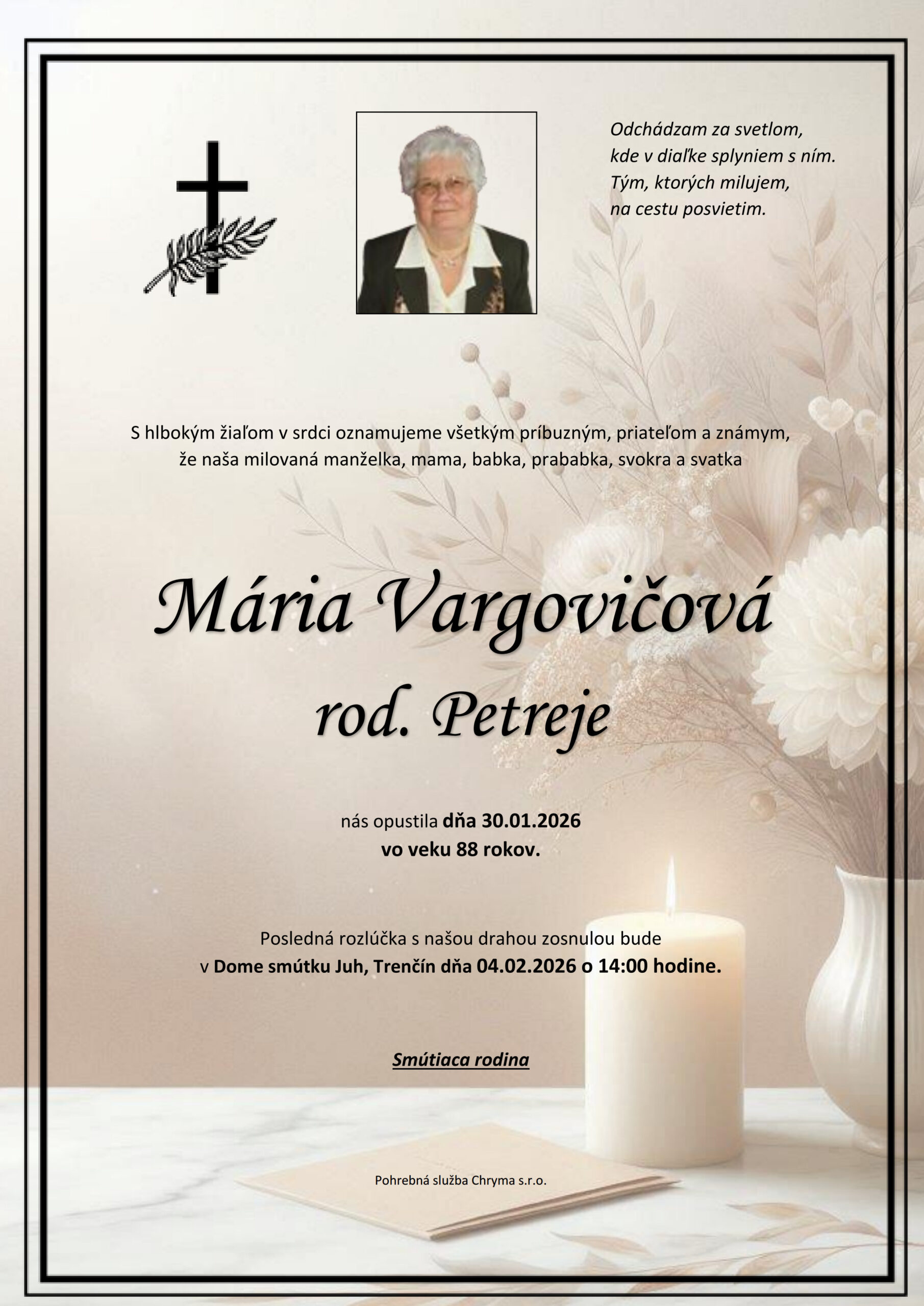 S hlbokým žiaľom oznamujeme všetkým príbuzným, priateľom a známym, že Mária Vargovičová rod. Petrejová nás opustil(a) dňa: 30.01.2026, vo veku 88 rokov. Posledná rozlúčka sa uskutoční dňa: 04.02.2026.