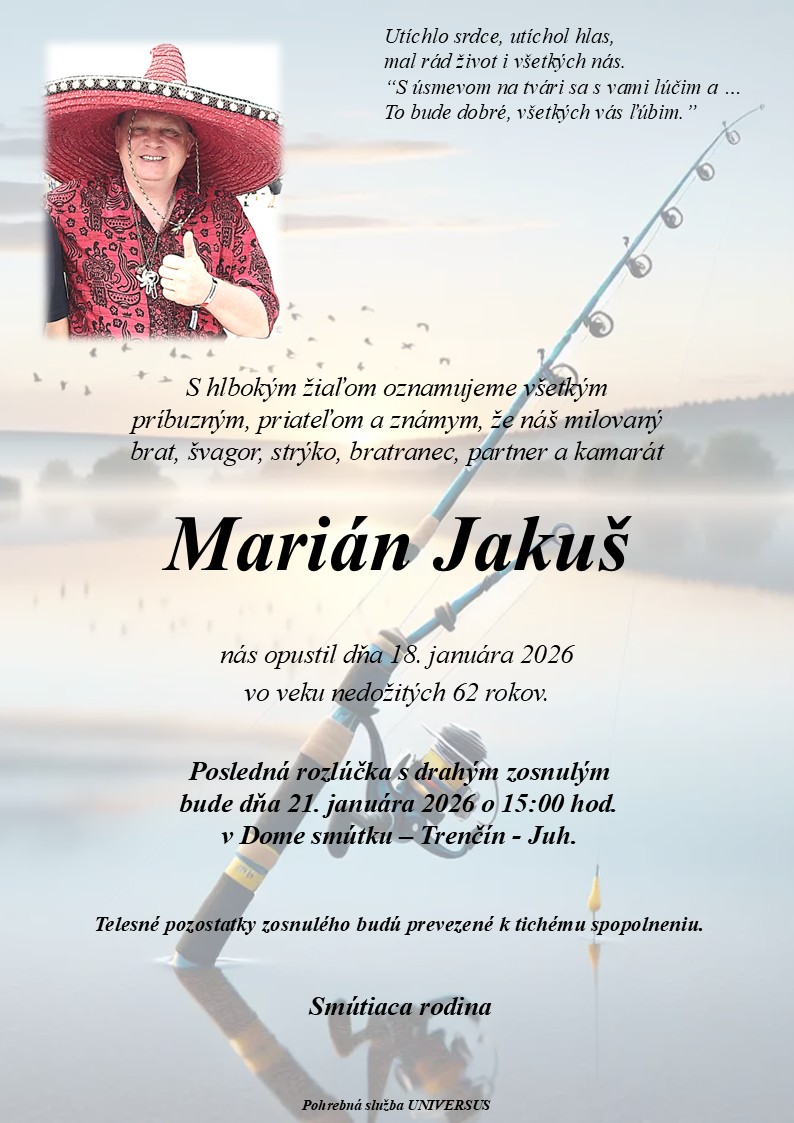 ⏱️ Čas čítania: 1 min (38 slov) S hlbokým žiaľom oznamujeme všetkým príbuzným, priateľom a známym, že Marián Jakuš nás opustil(a) dňa: 18.01.2026, vo veku 62 rokov. Posledná rozlúčka sa uskutoční dňa: 21.01.2026.