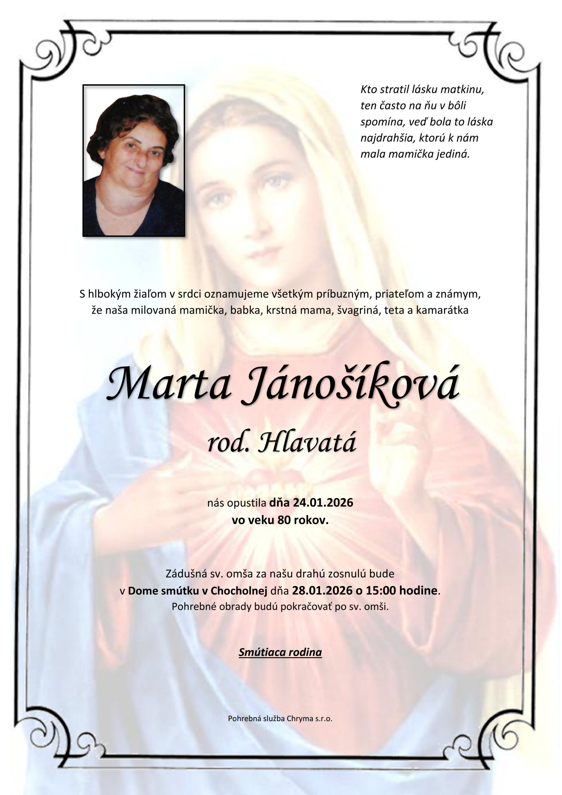 S hlbokým žiaľom oznamujeme všetkým príbuzným, priateľom a známym, že Marta Jánošíková rod. Hlavatá nás opustil(a) dňa: 24.01.2026, vo veku 80 rokov. Posledná rozlúčka sa uskutoční dňa: 28.01.2026.