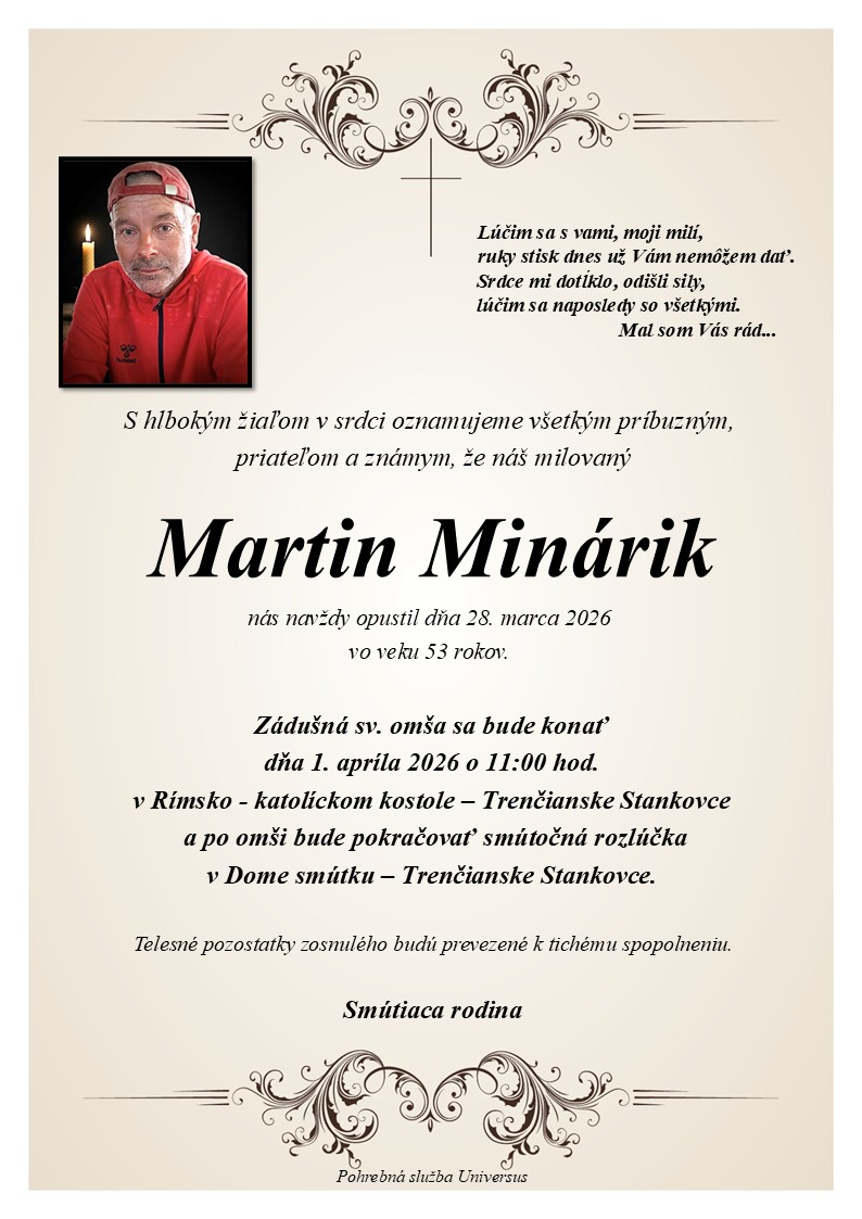S hlbokým žiaľom oznamujeme všetkým príbuzným, priateľom a známym, že Martin Minárik nás opustil(a) dňa: 28.03.2026, vo veku 53 rokov. Posledná rozlúčka sa uskutoční dňa: 01.04.2026.