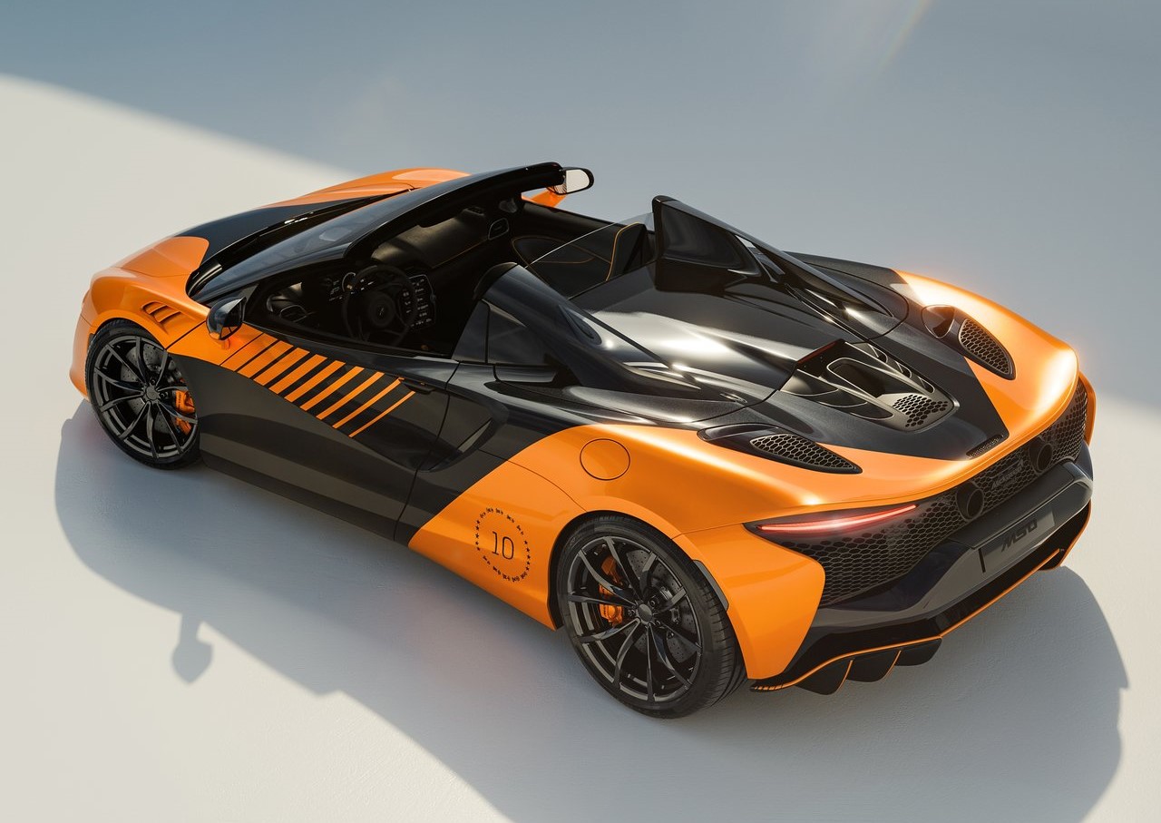 Exteriér vozidla zaujme ručne lakovanou kombináciou farieb Myan Orange a Onyx Black, ktorá odkazuje na víťazný monopost z roku 2025. Na karosérii sa nachádzajú špeciálne motívy s číslom „10“, doplnené o desať hviezd a siluety všetkých monopostov McLarenu, ktoré v minulosti získali titul konštruktérov. Dizajn dopĺňa Black Pack, 10-lúčové ultraľahké disky kolies v lesklej čiernej farbe, oranžové brzdové strmene McLaren a športový výfuk.